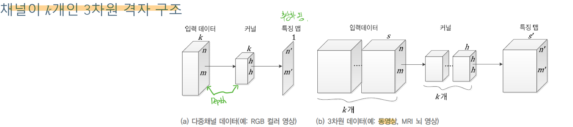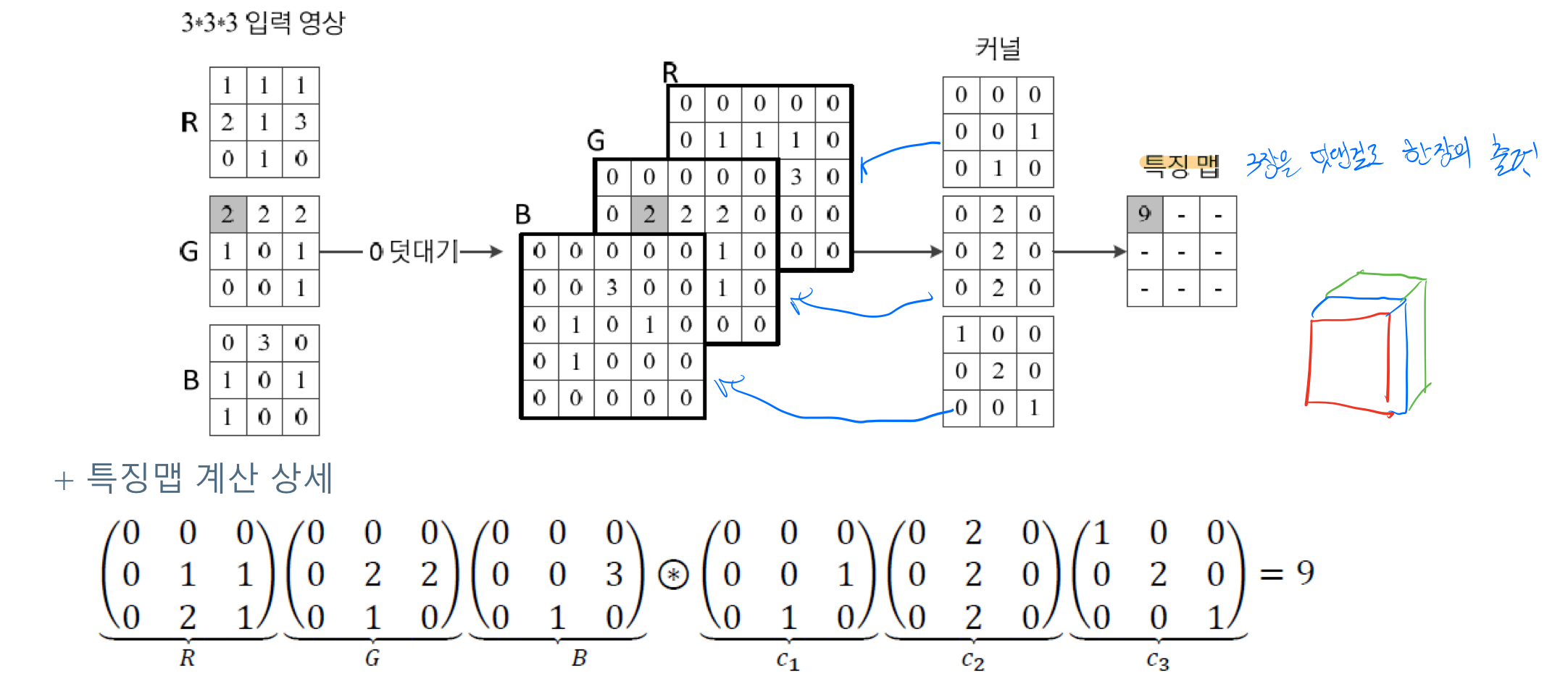 일반적인 이미지는 RGB의 값으로 하나의 픽셀이 이루어진다. 그렇기 때문에 RGB에 해당하는 각각의 커널(필터)를 합성곱연산을 통해서 구해야 한다. 뽑혀낸 특징맵은 이 3가지 RGB의 커널을 사용해서 얻어낸 값들을 토대로 만들어 진다. 한픽셀의 특징은 RGB의 값들이 서로 연관이 있을 것이기 때문이다.