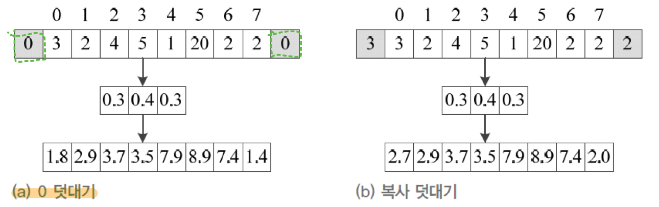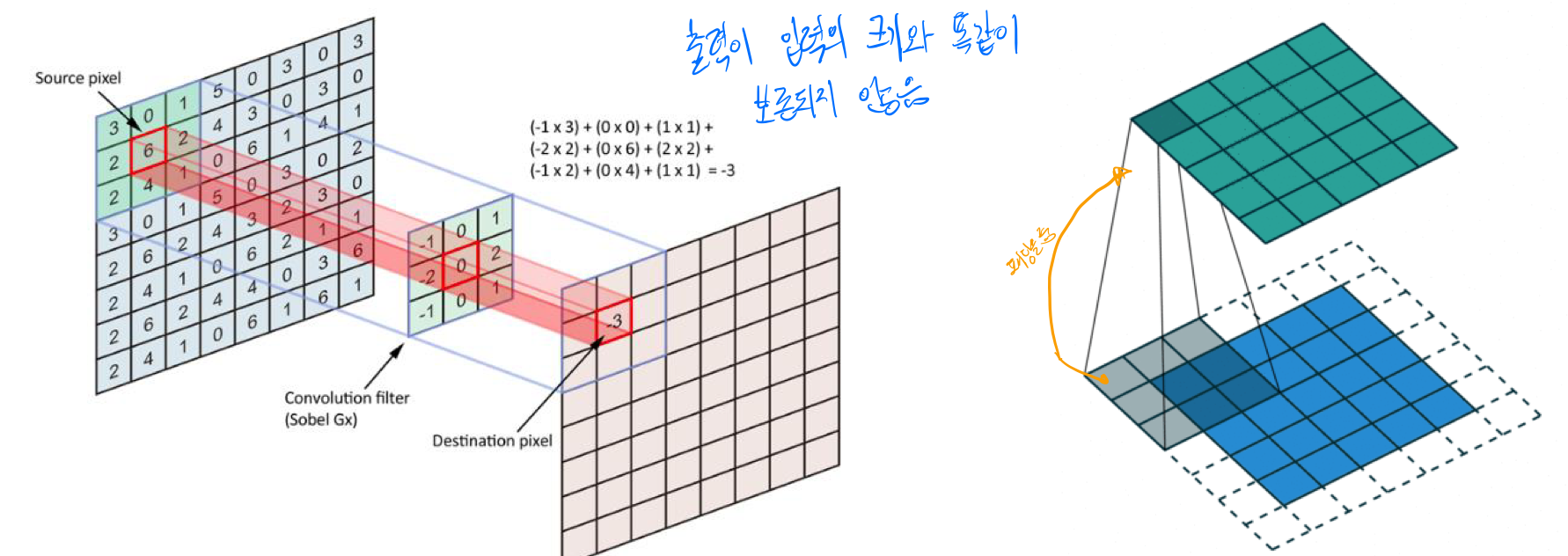 커널을 거쳐 나온 출력값은 입력층의 크기가 똑같이 보존되지 않는다. 위 그림을 보면 쉽게 이해가 갈 것 이다. 그렇기 때문에 입력층에 덧대기(padding)을 추가하여 가장자리때문에 크기가 감소하는 것을 막는다. 여기에는 0 덧대기와 복사 덧대기의 방법이 존재하며, 주로 0 덧대기의 방법을 사용한다.