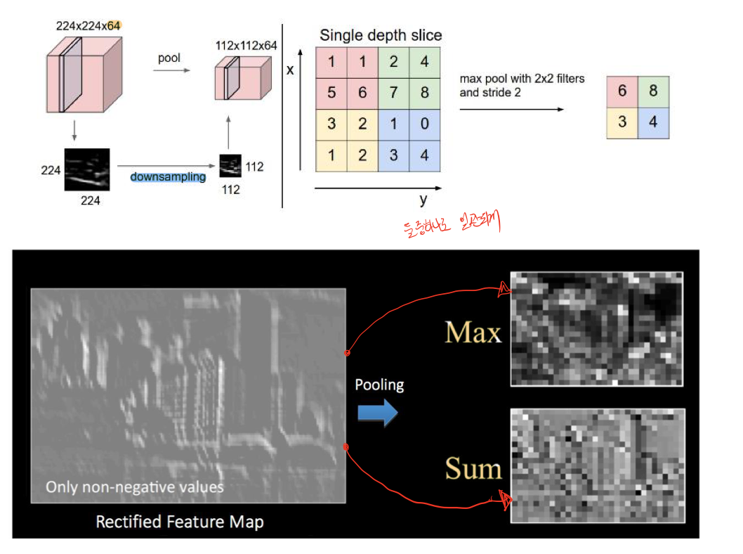 통계적 대표값을 활용하여, 특징맵의 정보를 요약한다. 최대값,평균값 등등을 활용하여 요약할 수 있는데 최근에는 minor한 정보더라도 중요한 정보가 일수도 있는데 이러한 값이 누락 될 위험이 있기 때문에 잘 사용하지 않는다고 하셨다.