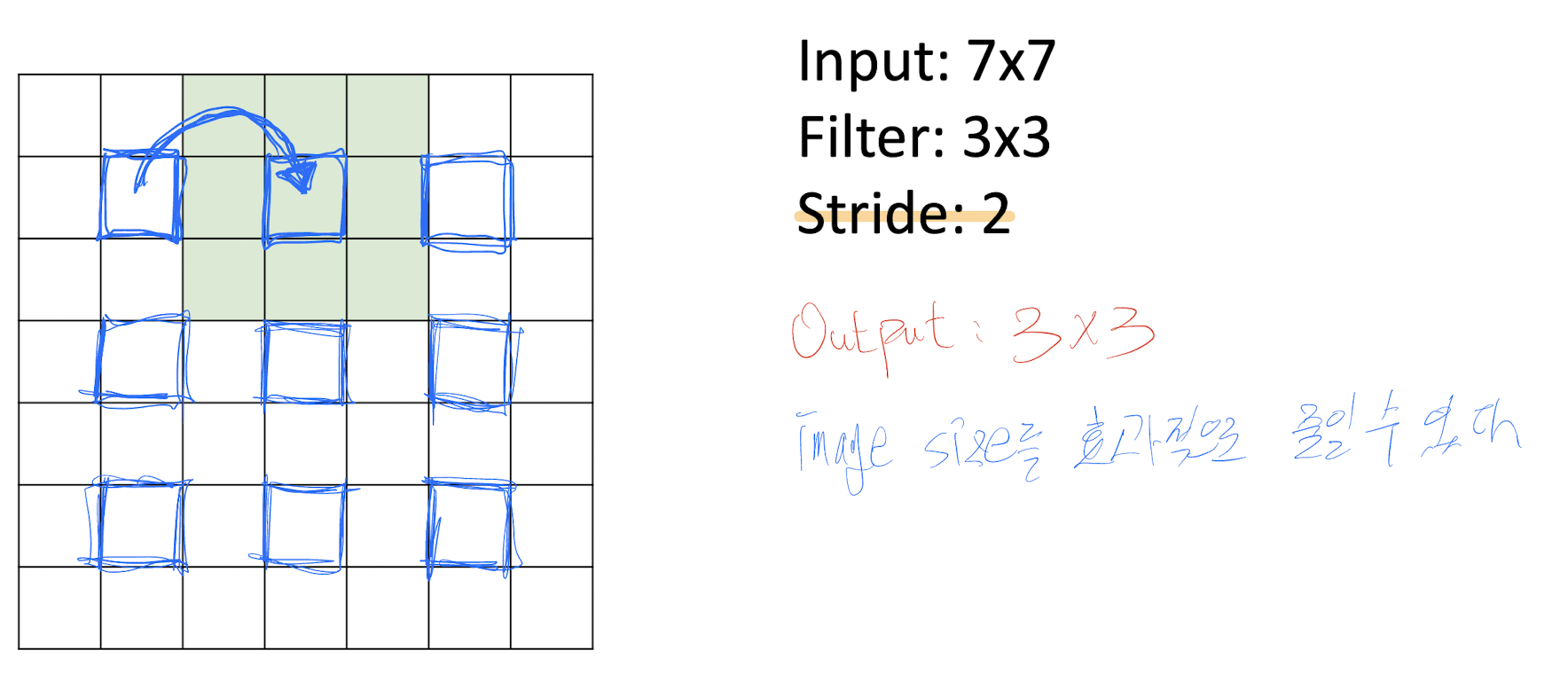 필터의 보폭을 조절하여 출력 사이즈를 downsize시킬 수 있다. 예를 들어 보폭을 2로 설정한다면 필터는 위 파란색 원과 같이 돌게 될 것이다.