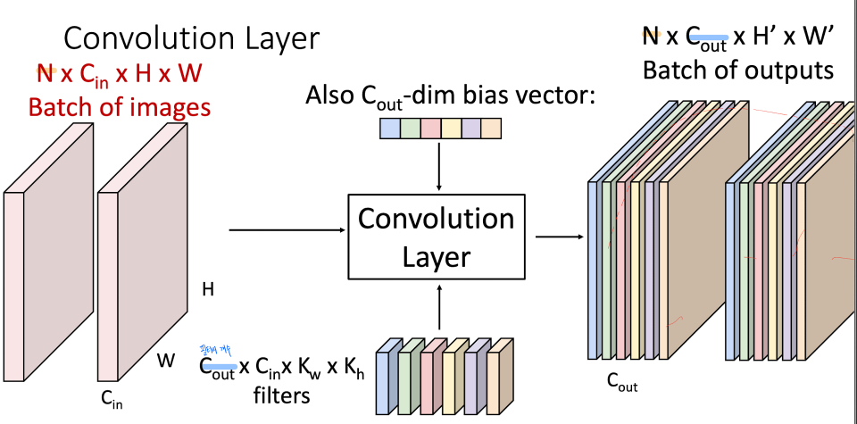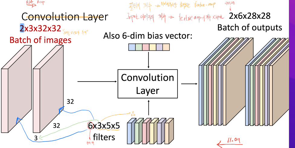 N * (필터 갯수) * (new_height) * (new_width)가 될 것이다. 출력의 height와 width는 인풋크기, 필터크기, stride등에 의해 결정 된다.