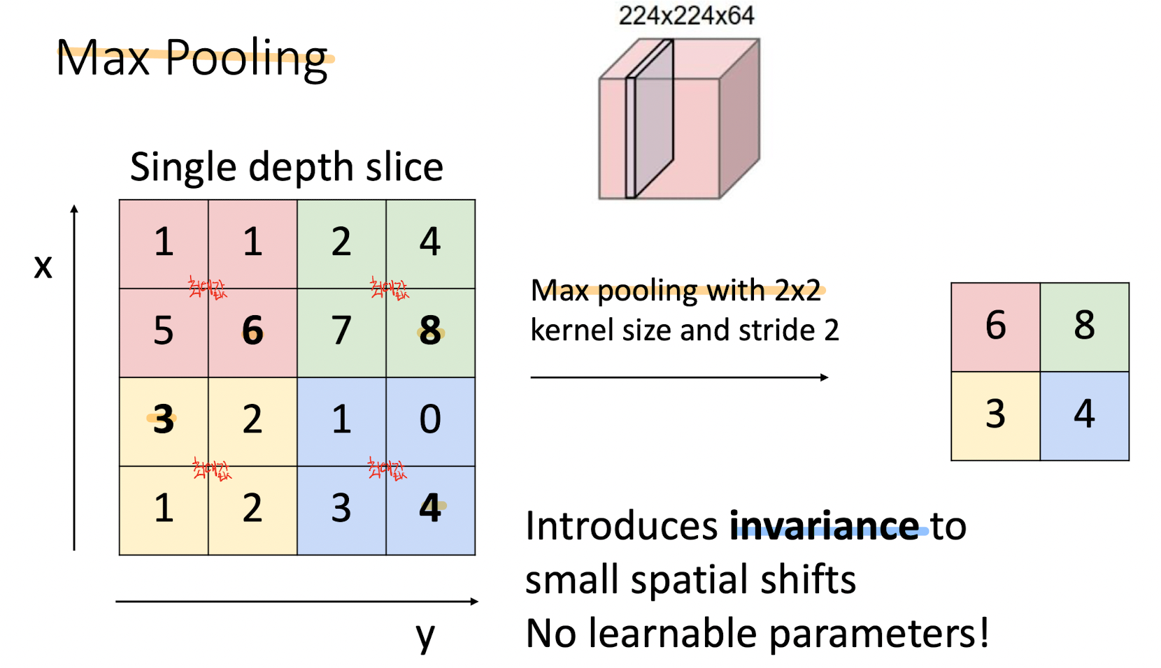 위 그림과 같이, Max-pooling을 사용한다면, 위 그림과 같이 잘라보게 된다. 2*2 와 stride가 2일때의 상황이다.