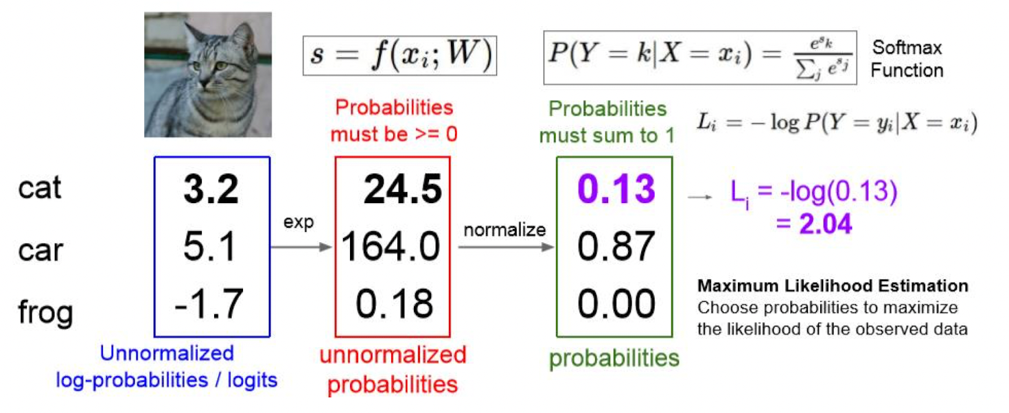 아래와 같이, 출력값을 softmax로 0~1사이의 확률적 요인으로 근사화 시킨 뒤, 정답 라벨과의 오차를 구하게 된다.