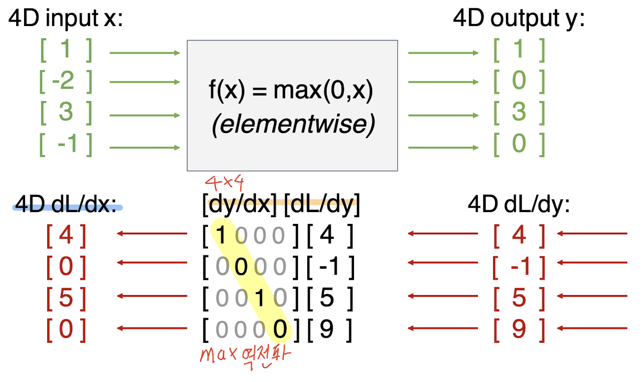 다음과 같이 ReLu를 거쳤다고 가정했을때, 어떻게 구해지는 봐보자.