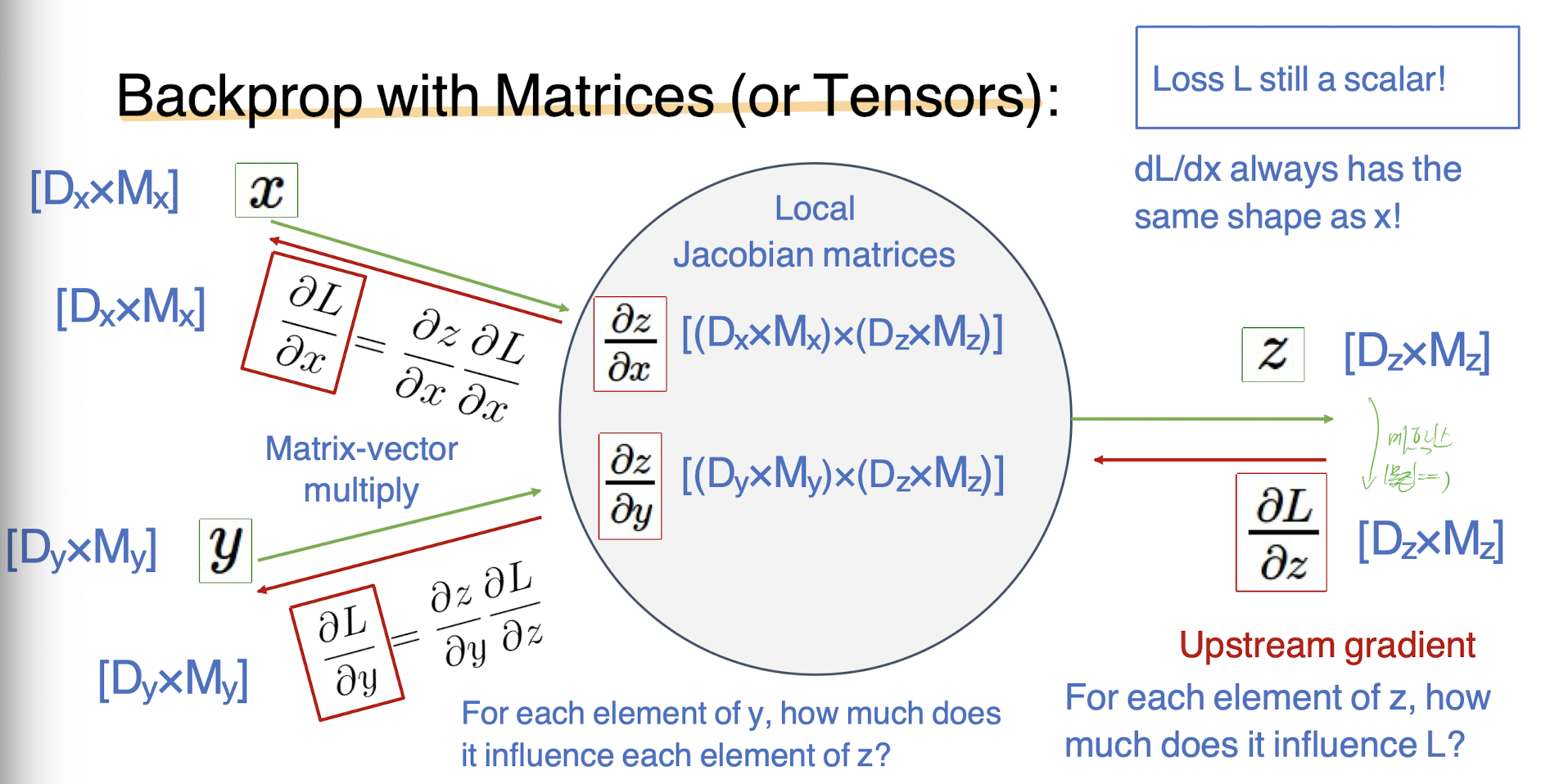 다음과 같은, x나 y의 그래디언트를 찾아야 한다고 했을때, dL/dz의 업스트림그래디언트를 로컬그래디언트에 곱해서 얻어낼 수 있다. 그러나 입력값이 벡터라면, 이 LocalGradeint를 구할때 자코비안행렬이 나오고 그 크기는 Dx * Dz가 된다.
