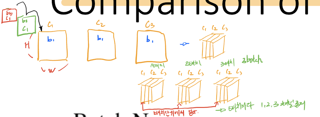 배치 단위로 정규화는 한다는 것은, 보는 데이터가 배치갯수(N)이 된다. 한 데이터 input이 3개의채널로 이루어져 있을때, 이렇게 3개의 채널로 이루어진 데이터가 N(배치)개가 존재하게 된다. 그럴 때, 배치단위로 본다는 것은, 1번데이터 C1 , 2번데이터 C1, 3번 데이터 C1 .. N번 데이터 C1을 함께 보게 되는 것이고, 채널 갯수만큼 보게 된다.