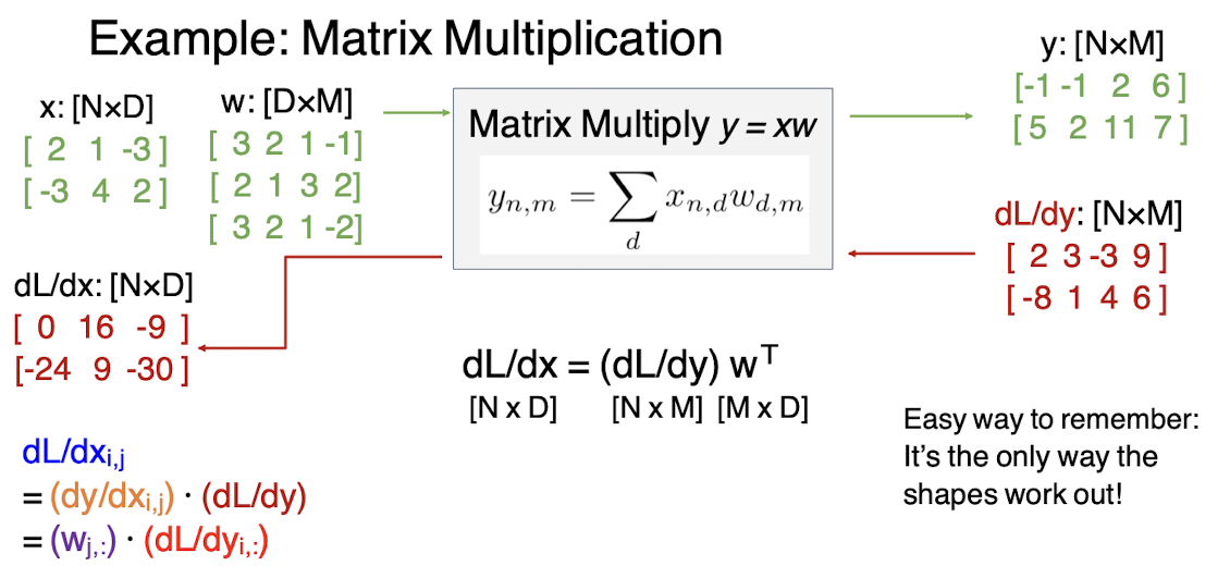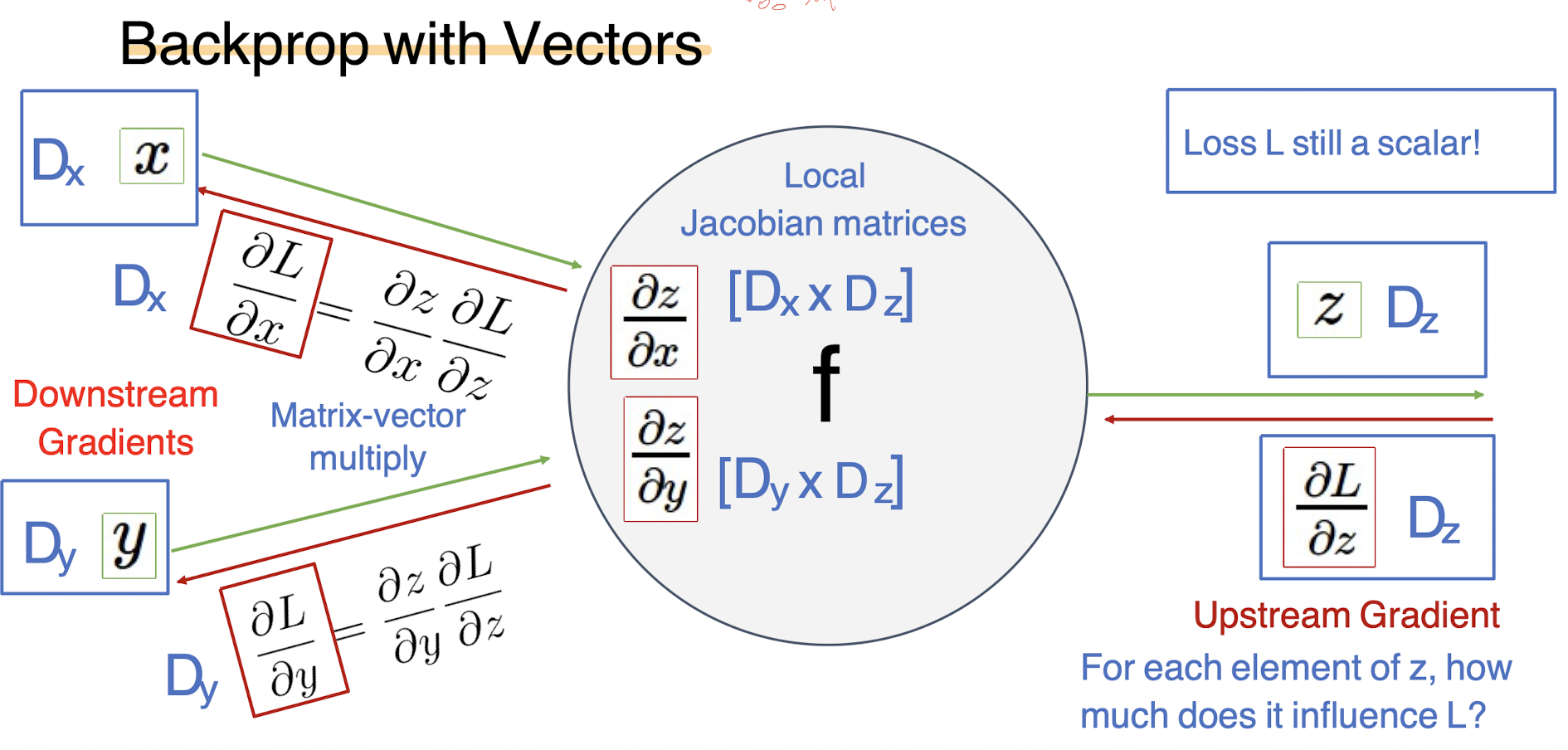 다음과 같은, x나 y의 그래디언트를 찾아야 한다고 했을때, dL/dz의 업스트림그래디언트를 로컬그래디언트에 곱해서 얻어낼 수 있다. 그러나 입력값이 벡터라면, 이 LocalGradeint를 구할때 자코비안행렬이 나오고 그 크기는 Dx * Dz가 된다.