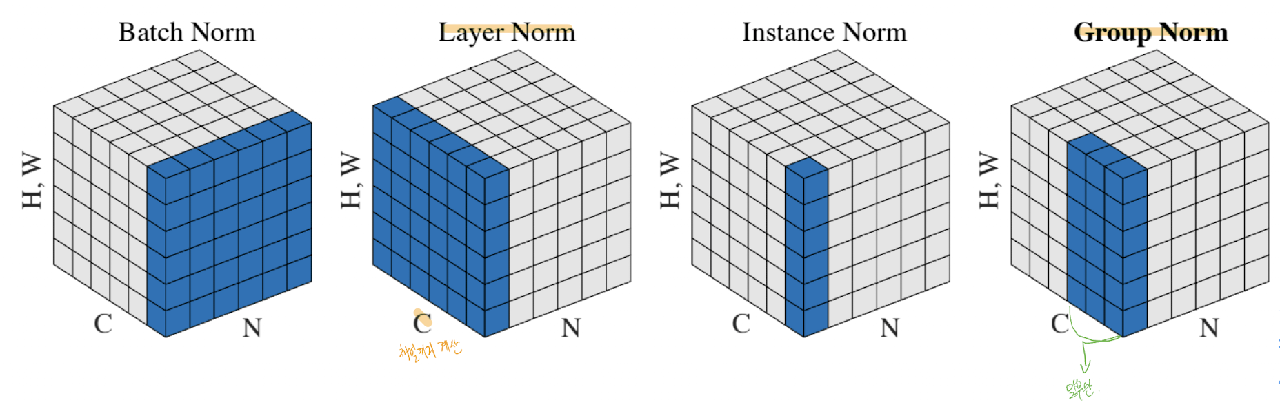 그렇다면 CNN의 구조에서는 이러한 채널이 들어 있기 때문에, 아래와 같이 normalize를 계산할 수 있다.