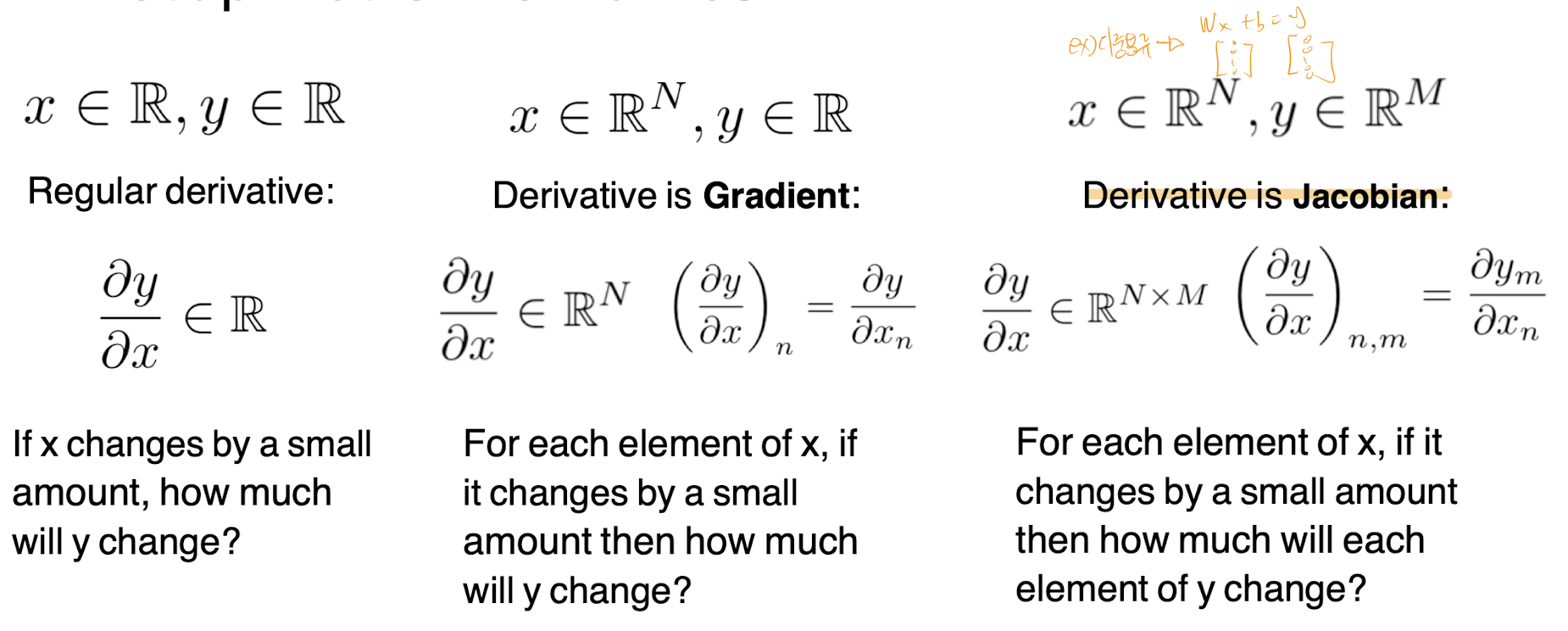 스칼라,스칼라의 미분은 일반적인 미분이었다면, 입력이 N차원 출력이 스칼라일때는, 그래디언트였다. x,y모두가 N차원이라면 이를 자코비안이라고 한다.