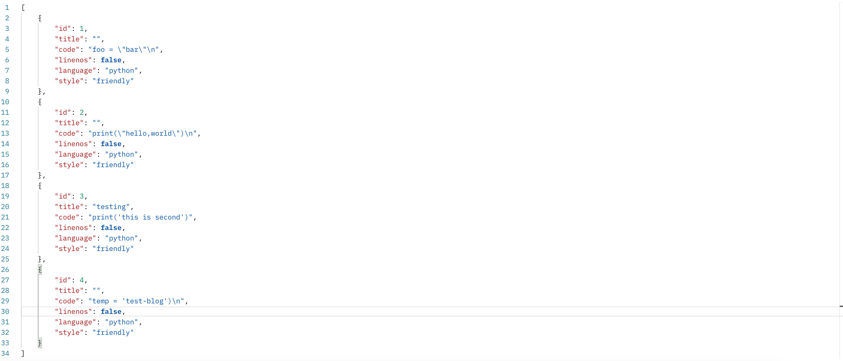 fields = ['id', 'title', 'code', 'linenos', 'language', 'style']