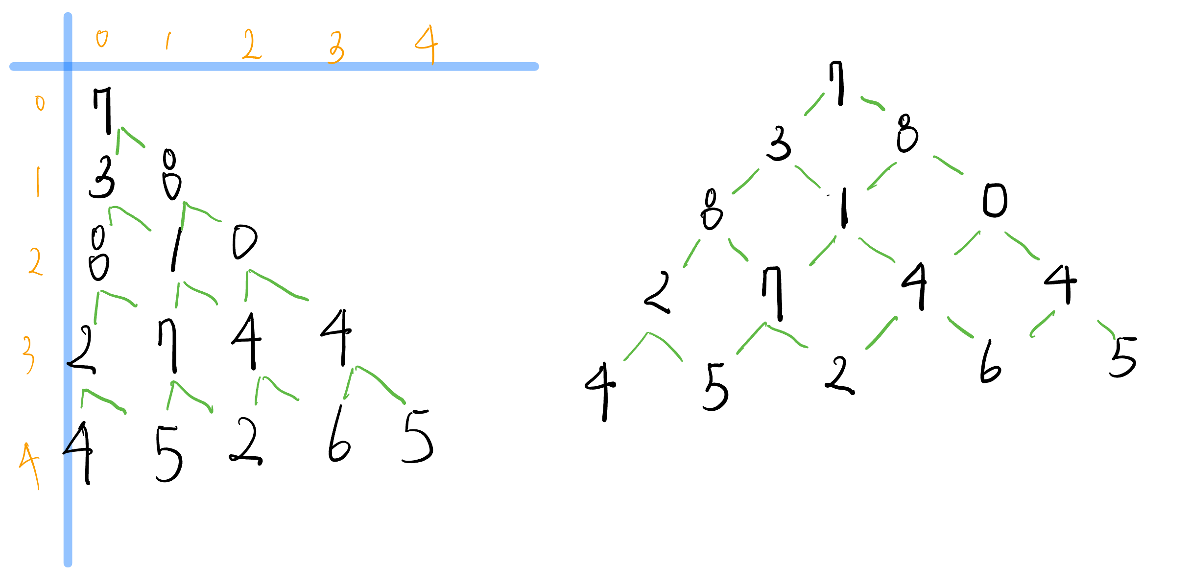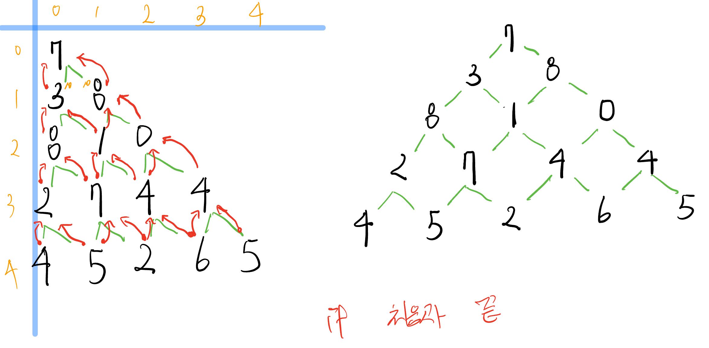- 먼저 문제에서 주어진 정수 삼각형의 틀가 실제 배열로 들어오는 정수 삼각형의 모양이 다르다는 것을 알고, 이 두개가 똑같이 맵핑시킬 수 있는지에 대한 관계를 찾았다.