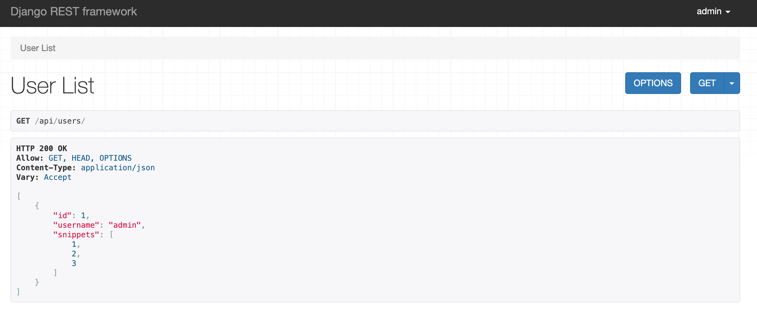 ## '/users/' 엔드포인트로 이동하여 각 사용자의 '스니펫' 필드에 각 사용자와 연결된 스니펫 ID 목록이 표시확인