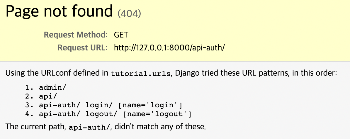 DRF공식문서에는 여기까지 따라하면 새로고침하면, Login링크가 생긴다고하는데.. 그건 개뿔 눈 코빼기도 안보인다.. 구글링하러 간다 ㅠ