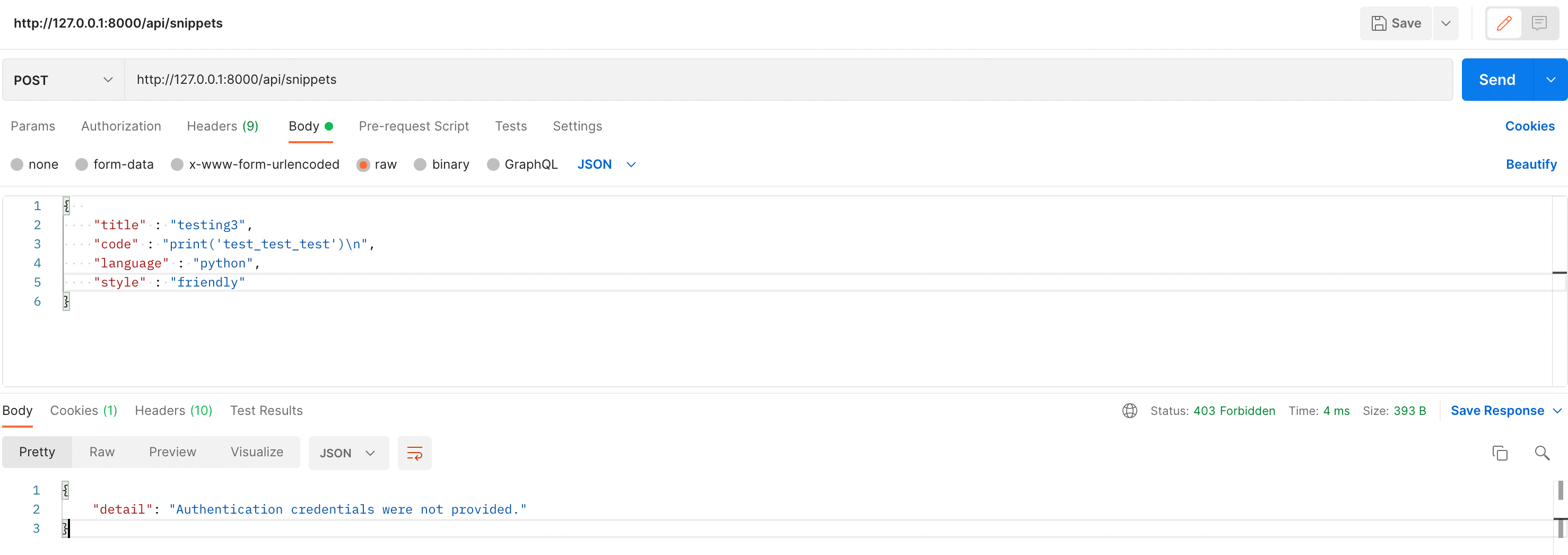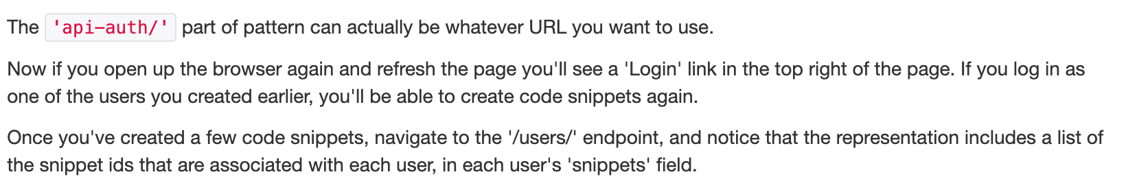 일단 여기까지 하고 실행해보면 colum에서 뭔 user를 찾을수없다고도하고, DRF공식문서가 말하기로는 새로운 snippets를 추가할 수 없다고한다. 왜냐하면 우린 로그인인증 기능을 만들었기 때문에 그 기능을 활용해야하기 때문이다. 그래서 인증을 담당하는 것을 추가해준다