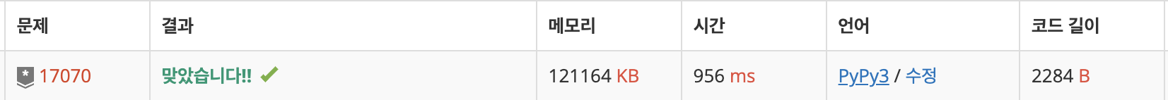 - python3로 제출하면 시간초과가 발생한다. 코드 최적화(?)없이 pypy3로 제출했을때도 시간초과가 발생했고 시간을 줄이기 위해서 최적화를 수행했다.