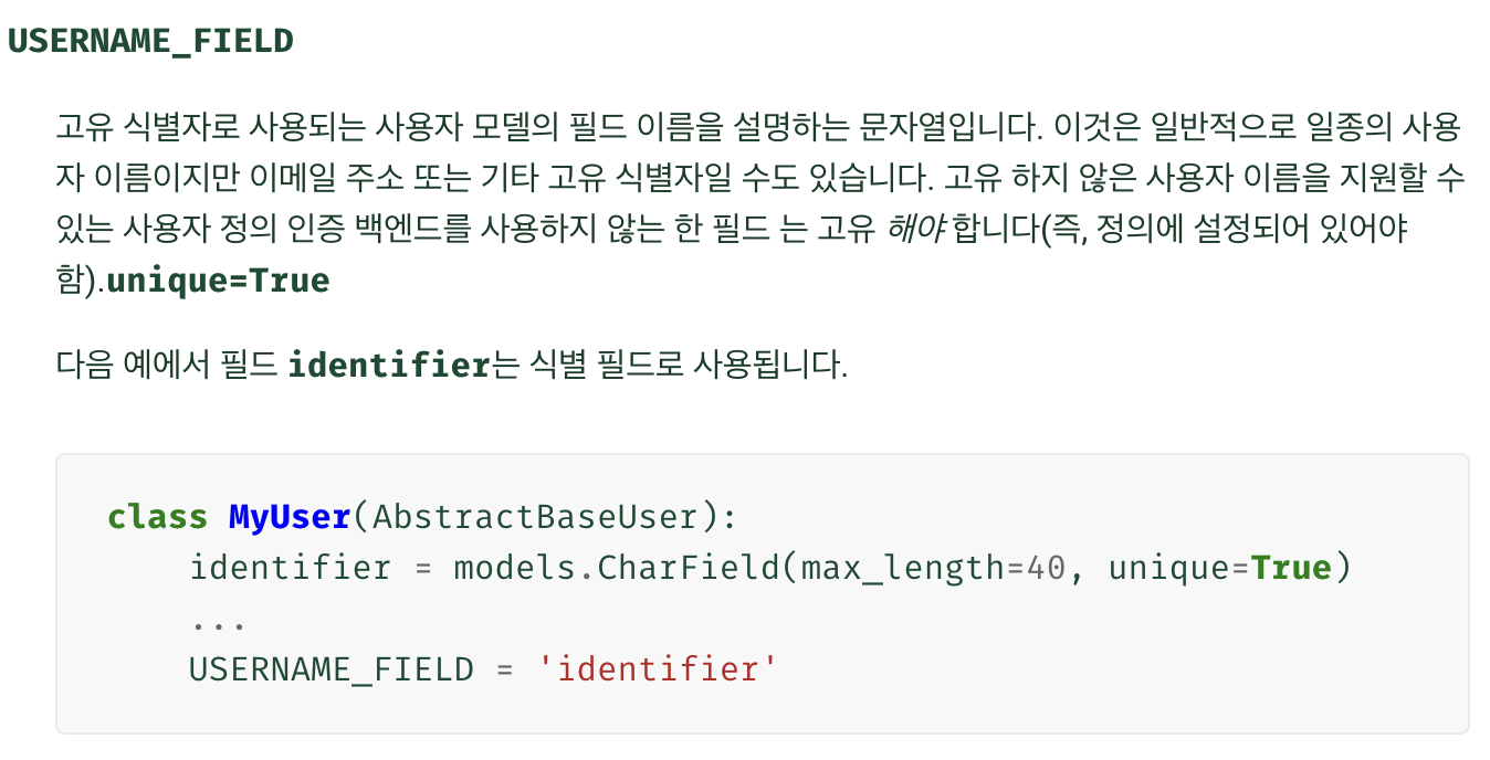 - get_by_natural_key(사용자 이름) : 에서 지정한 필드의 내용을 사용하여 사용자 인스턴스를 검색한다. USERNAME_FIELD