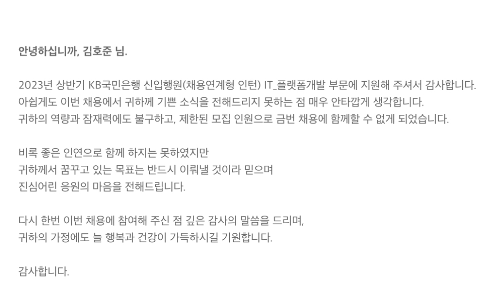 꽤 허탈했지만, 사실 은행권 코딩테스트가 궁금해서 거기까지만 가보자하는 마음에 지원했었고 여기까지 온 것만해도 좋은 경험이 됐다고 생각했다. 더 좋은 양분이 되어 본격적으로 취준을 해야하는 24년도에는 실패경험을 잘 복기하고 다듬어 꼭 원하는 기업에 취직해야겠다