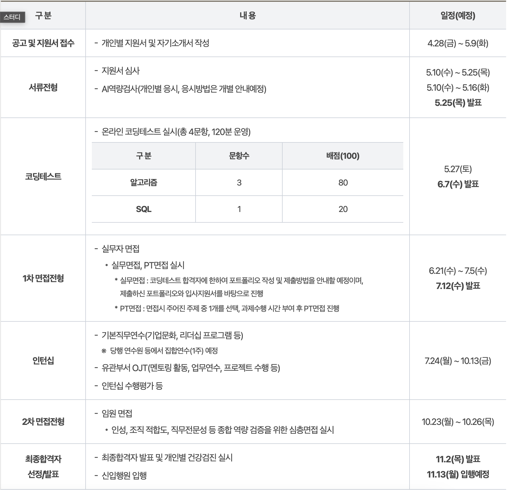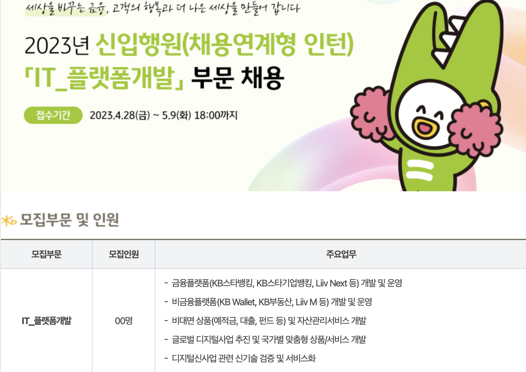 - 2023년도에는 공채가 진행되지 않았고 채용연계형 인턴으로 신입행원을 모집하는 형태였다. IT직군과 IT플랫폼직군 두 분류중 고민하다가 IT_플랫폼개발 직군에 지원했다.