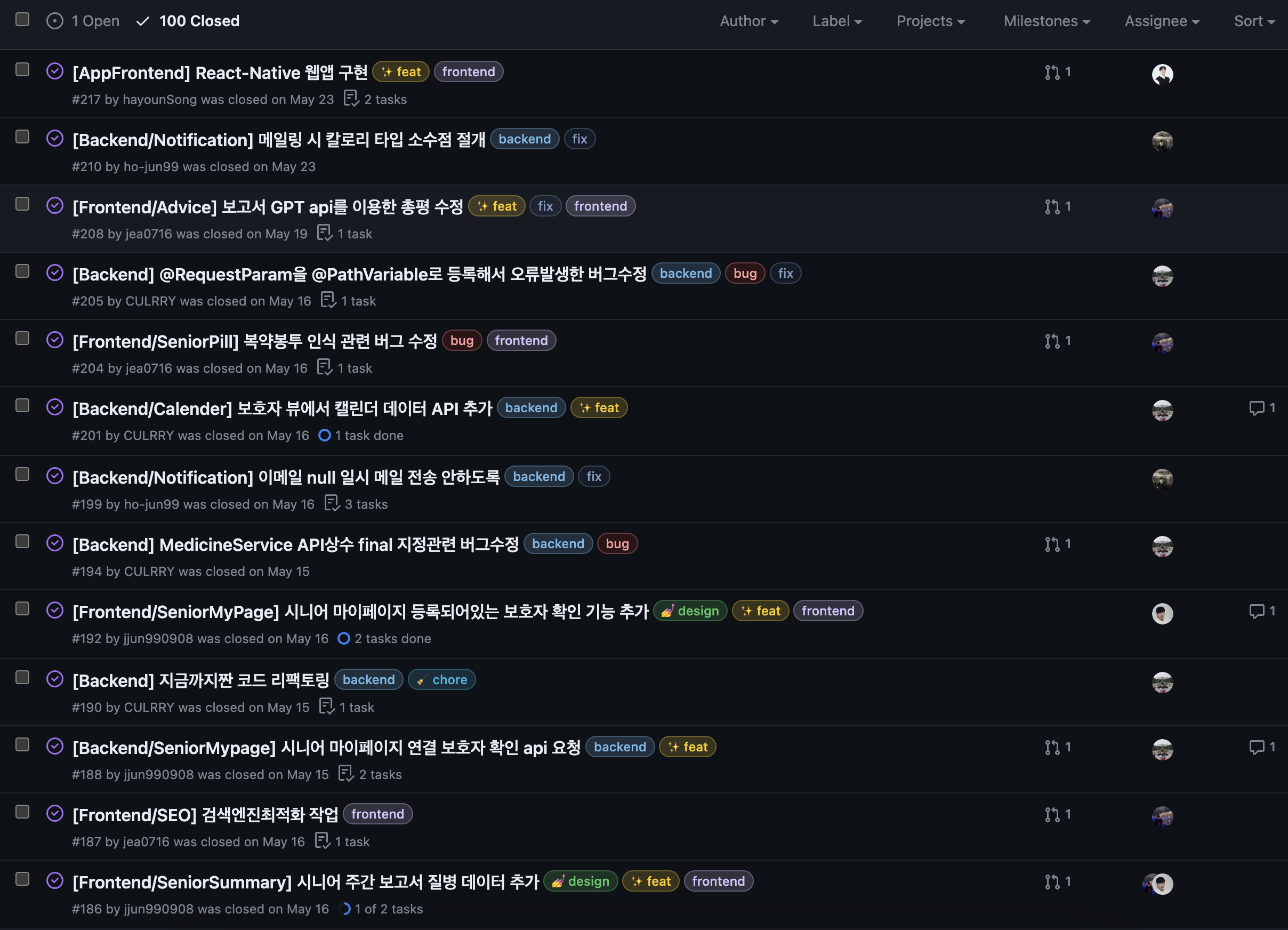 웃긴건 우리팀이 프로젝트를 끝냈을때 이슈가 101개 PR이 119개였다. 무슨 이슈제조기들도 아니고.. 컨벤션에 맞춰서 다들 열심히 분업한 결과라고 볼 수 있다.