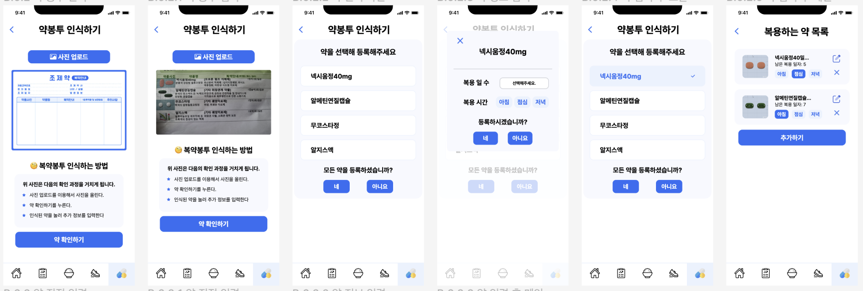 식단을 사진을 찍어서 이미지로 분석 받고, 처방전 사진을 찍어 약 정보를 공공데이터포탈에서 가져와 등록시킨다. 우리 앱에서 가장 복잡한 입력플로우는 운동 선택 -> 시간 입력플로우다. 터치 두번이면 끝나고 운동 종목도 많이 두지 않고 중장년층이 많이 이용하는 20개 종목으로만 추렸다.