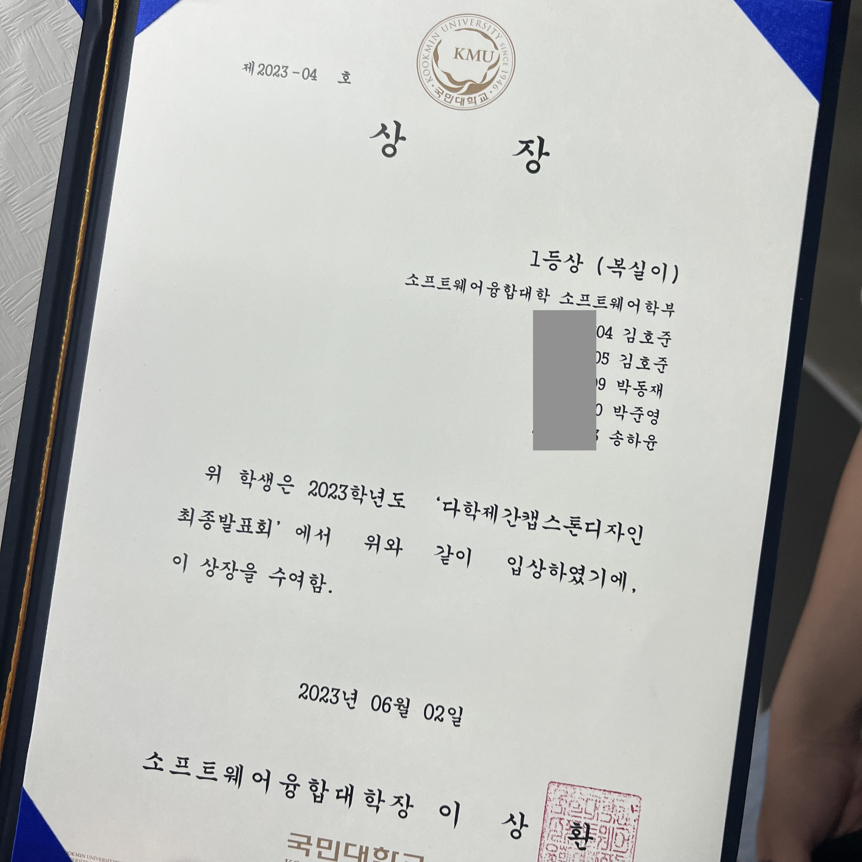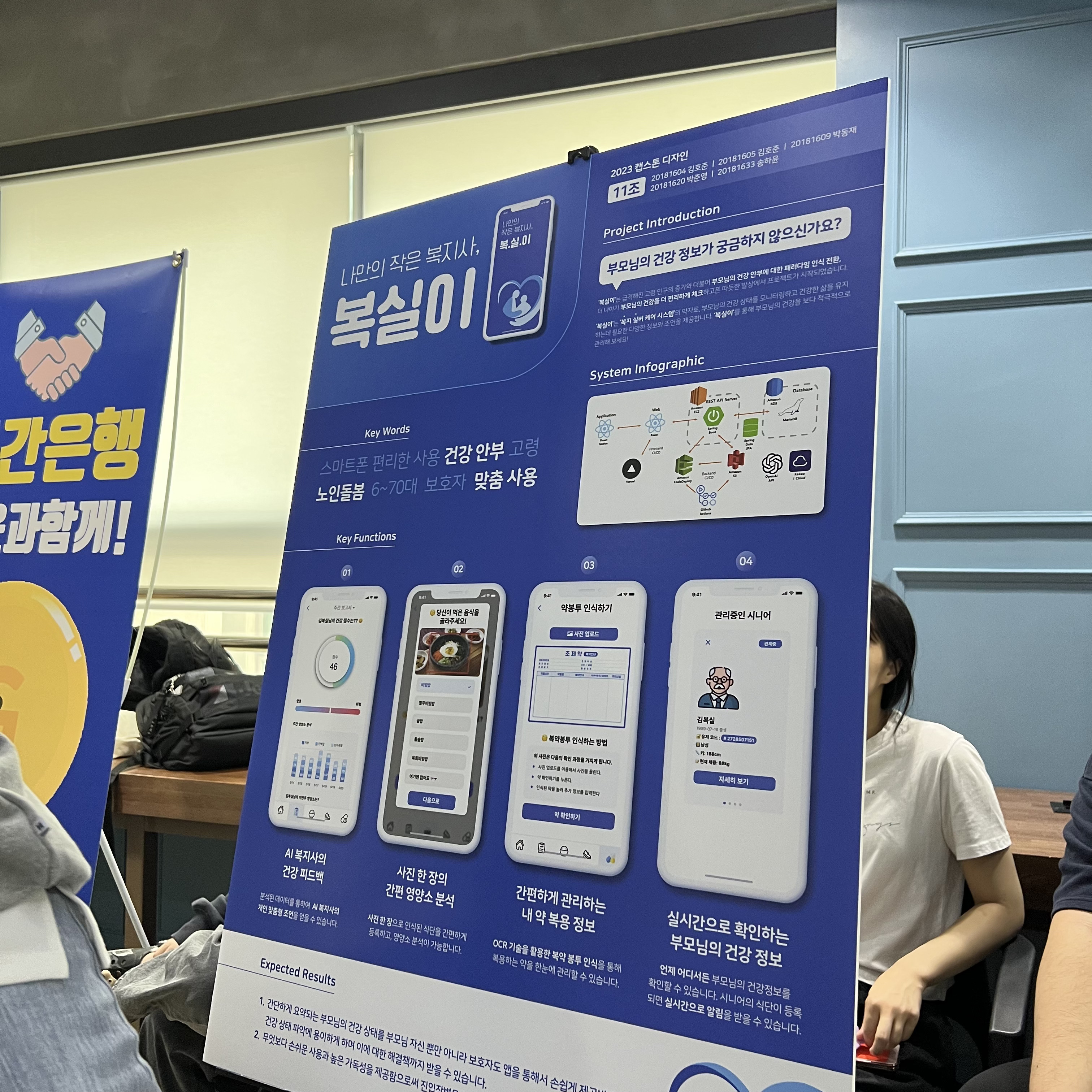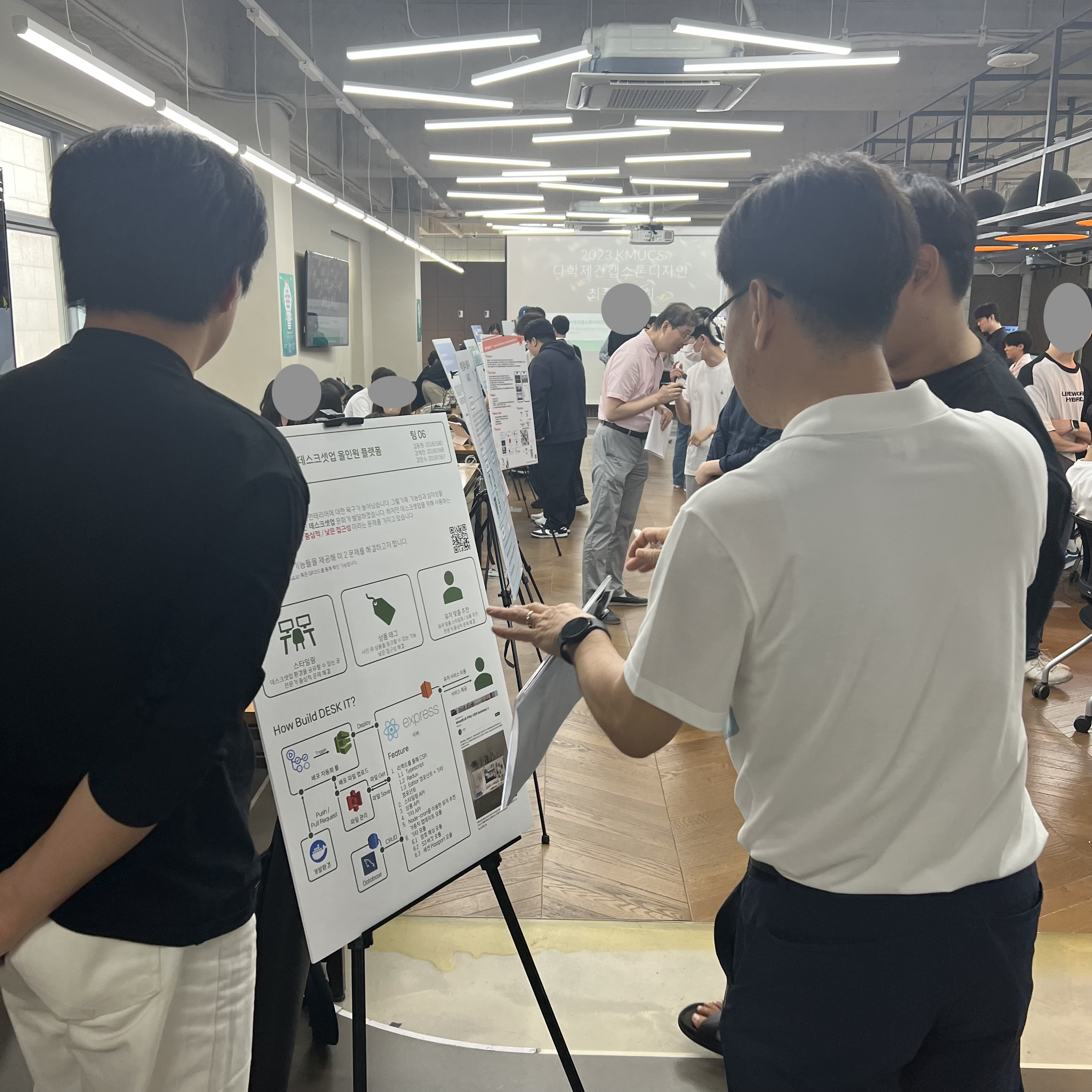 아무튼 최종발표도 성공적으로 끝내고 운좋게 본선까지 올랐다. 본선에서 또 운좋게 1등상을 받을 수 있었다. 물론 누구보다 열심히 했기 때문에 딱히 과분하다는 생각은 팀원 모두가 하지 않았다. 우리 학교에는 이렇게 캡스톤 프로젝트를 전시하고 교수님+학부생들이 돌아다니면서 궁금한것도 물어보고 대답해준다. 본선에서는 교수님 + 외부평가단이 합쳐져 대면발표를 하고 질의를 받았고 예상질문도 미리 대비했기에 잘 대답할 수 있었다.