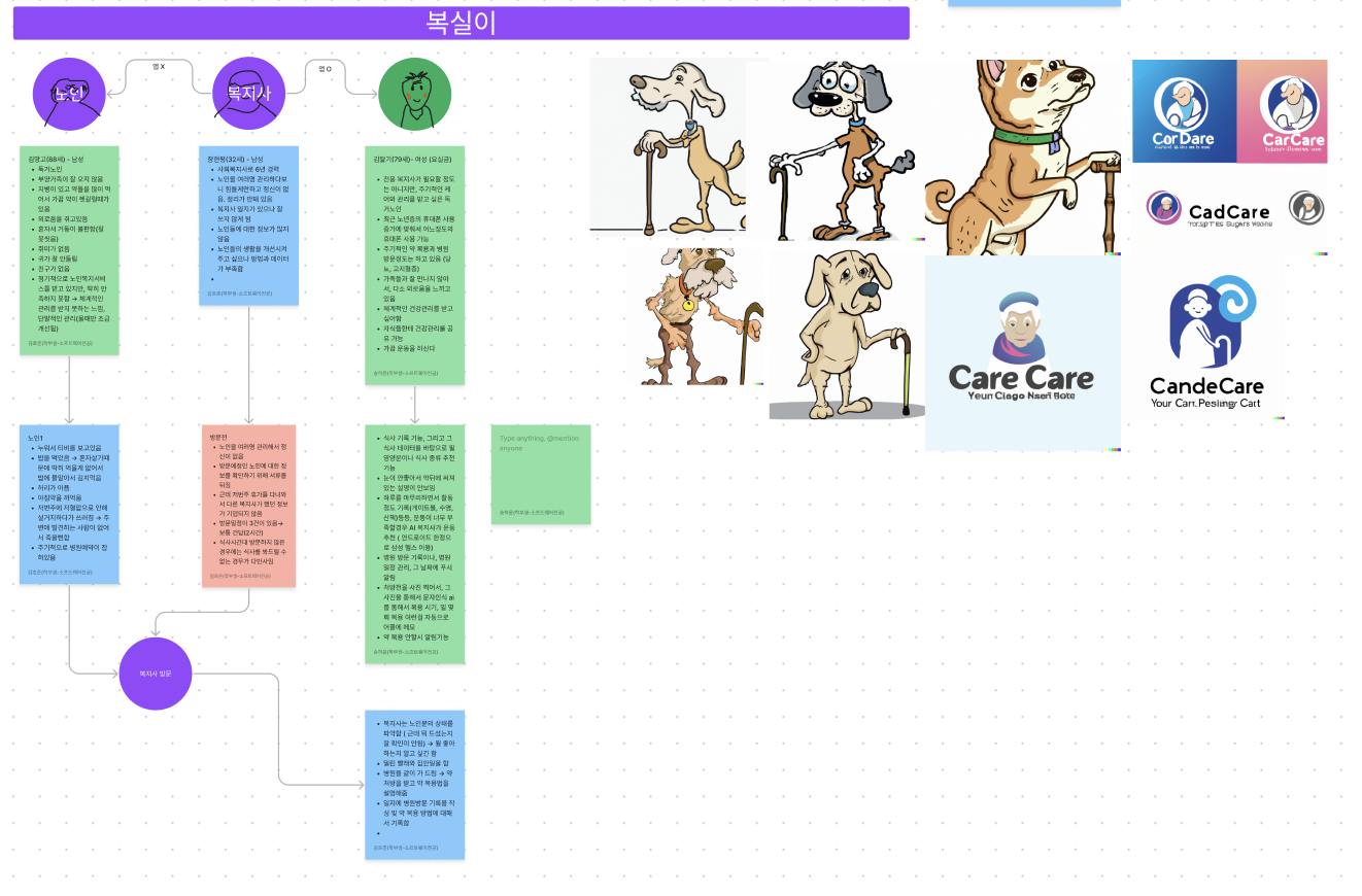 초기 복실이의 기획은 완성작과는 많이 달랐다. 복지사들이 피부양자들을 조금 더 쉽게 관리해주기 위해 중간의 매개체가 되는 수단이었다. 전에 진행했던 프로젝트에서는 꼭 위와 같은 페르소나를 만들었던 것이 인상 깊었고 딱히 아이디어를 도출하기 어려워서 가상의 페르소나와 상황들을 만들고 이어나갔다. 이를 통해 뭐가 필요해야할지 조금 보이는 느낌이었고, 한계점도 보였다.