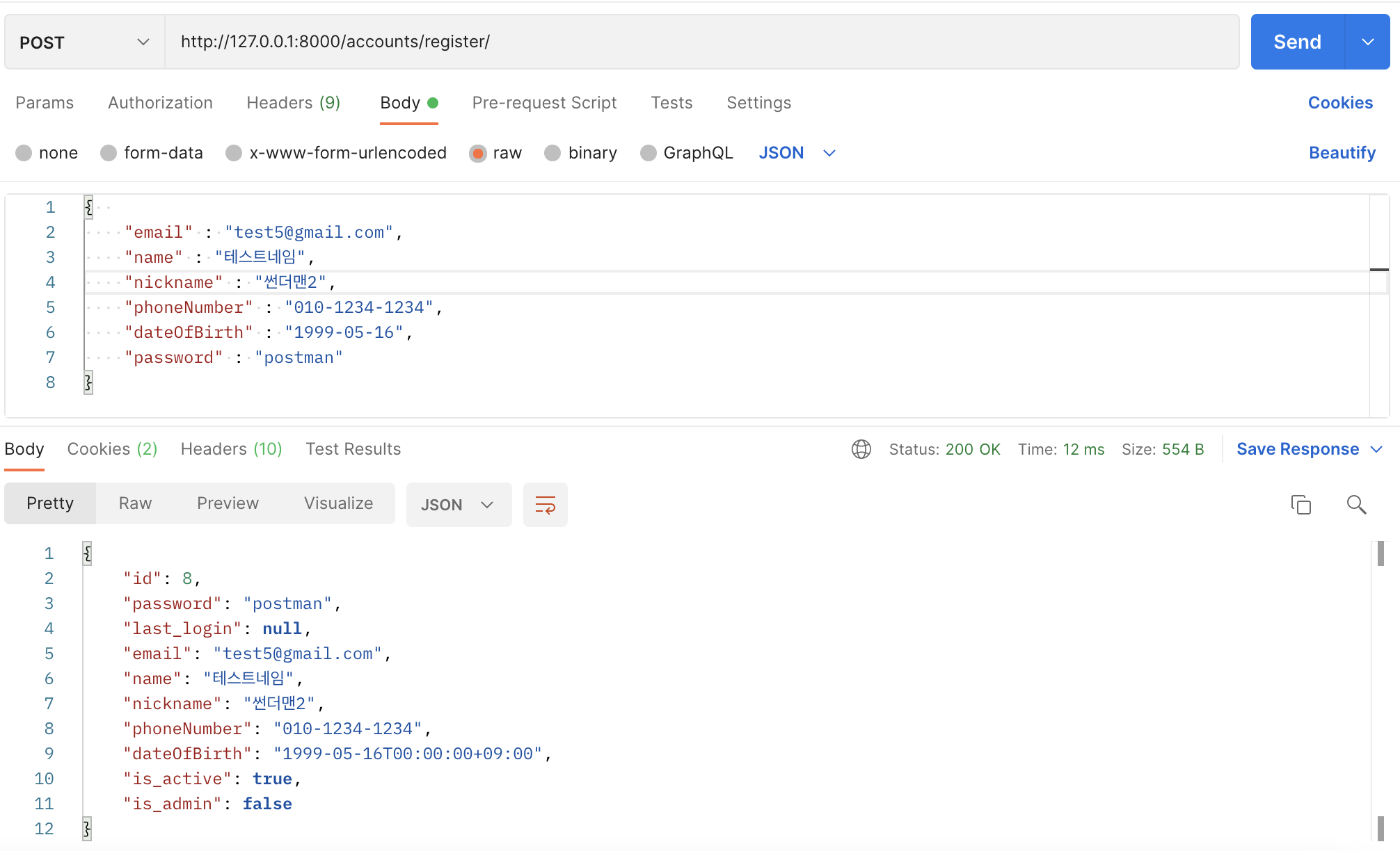 또 시리얼라이저에 해당코드를 넣어주게 된다면, response되는 데이터에서 password데이터는 오지 않는다. 참고하면 좋을거 같았다.