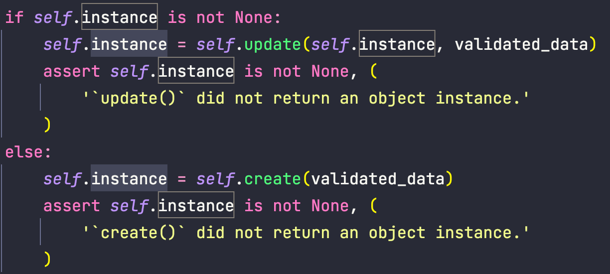위에서 봤던거와 같이 우리가 작성한 view에서 .save()메서드를 호출하면 상황에 따라 create() 또는 update()가 호출된다고 했다. 그렇기 때문에 create()와 update()를 오버라이딩 해주면 된다는 것이다. 나는 새로생성한경우에만 해줄거였기 때문에 create()에 대해서만 작성해 줬다. password를 확인하고 .set_pawword() 메서드를 사용하면 알아서 딱 저장시켜준다!