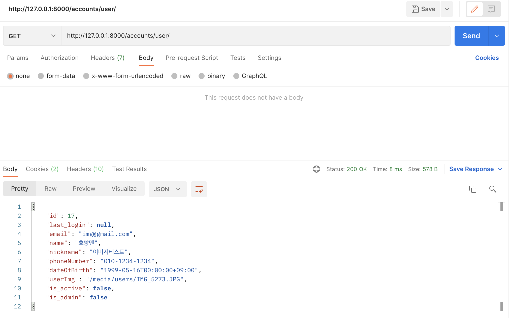 저렇게 userImg에서 use_url을 True로 해줘야 한다는 글도 많았는데 안해봤는데 똑같다. user_url을 별도로 지정하지 않으면 True가 기본값이라 그런거 같았다. 별도로 오버라이딩 하지 않아줘도 Meta에서 fields에서 해당 값이 들어가기 때문에 상관 없다.
