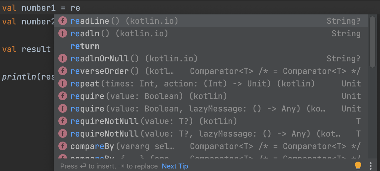 number1과 number2는 null일수도 있기 때문이다. 그 이유는 readLine() 메서드 자체가 String? 즉 "문자열 또는 null"을 담을 수 있도록 코틀린이 자체적으로 지정한 것이다. 아래 그림을 보면 알 수 있다.