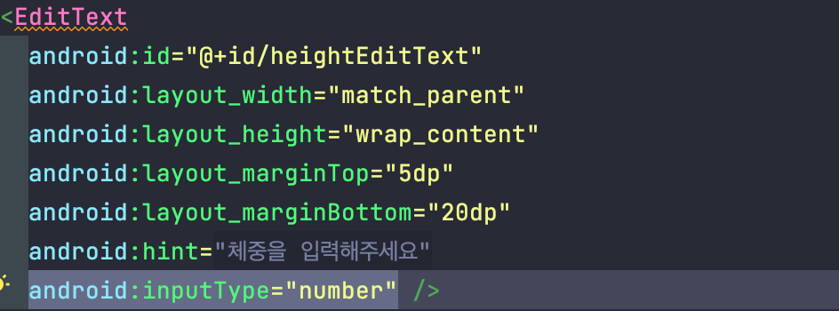 다음과 같이 EditText를 layout에 작성하고 inputType에 number라고 적어주게 되면 숫자키패드만 나와서 입력할 수 있게 해준다. 그저 뭘 입력하게만 해주는 기능이지, kotlin으로 안에 값을 가져올때는 무조건 string(문자열)형식이다.