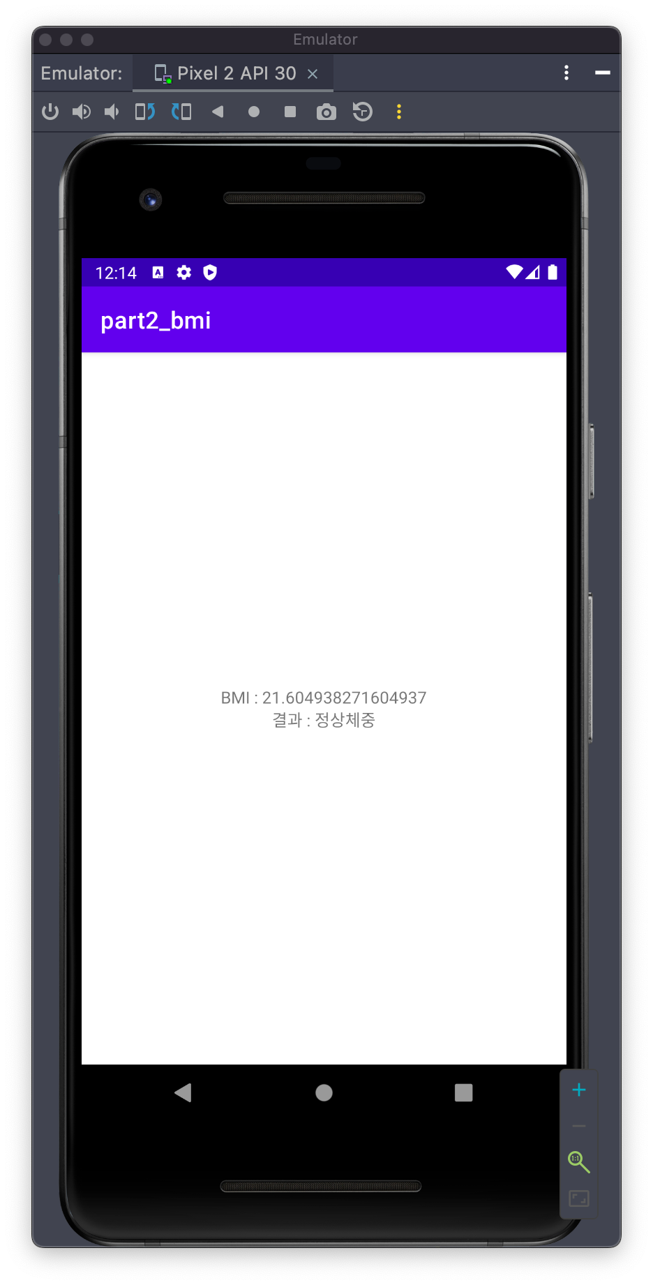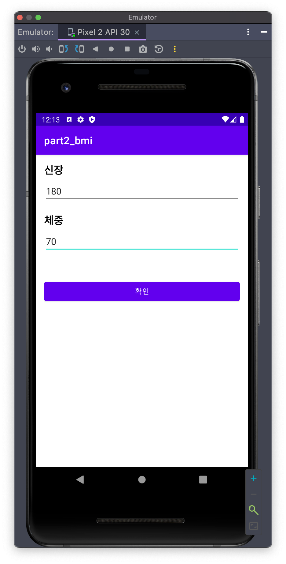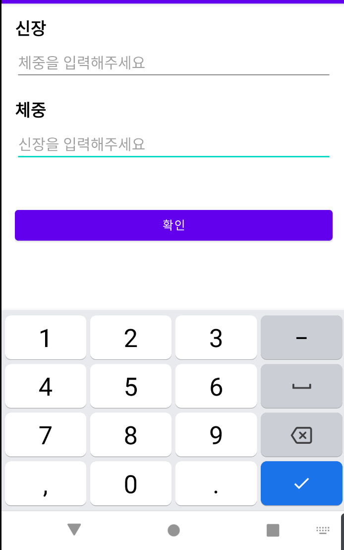 결과물은 아주매우 간단하다. 첫번째 액티비티에서 신장과 체중을 입력하면 두번째 액티비티를 인탠트로 연결하고 BMI계산식과 그 결과를 알려준다.