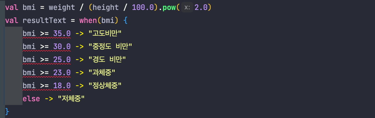 지금 의문점은 when(bmi)를 주면 빨간줄이 뜨는데 왜그런지 모르겠다..