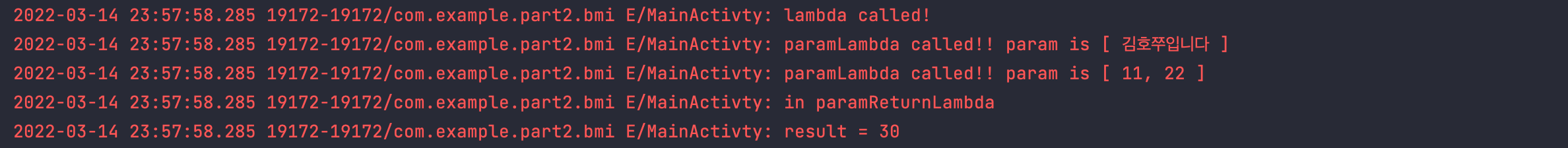 Log.e(tag, "paramLambda called!! param is [ $num1, $num2 ]")