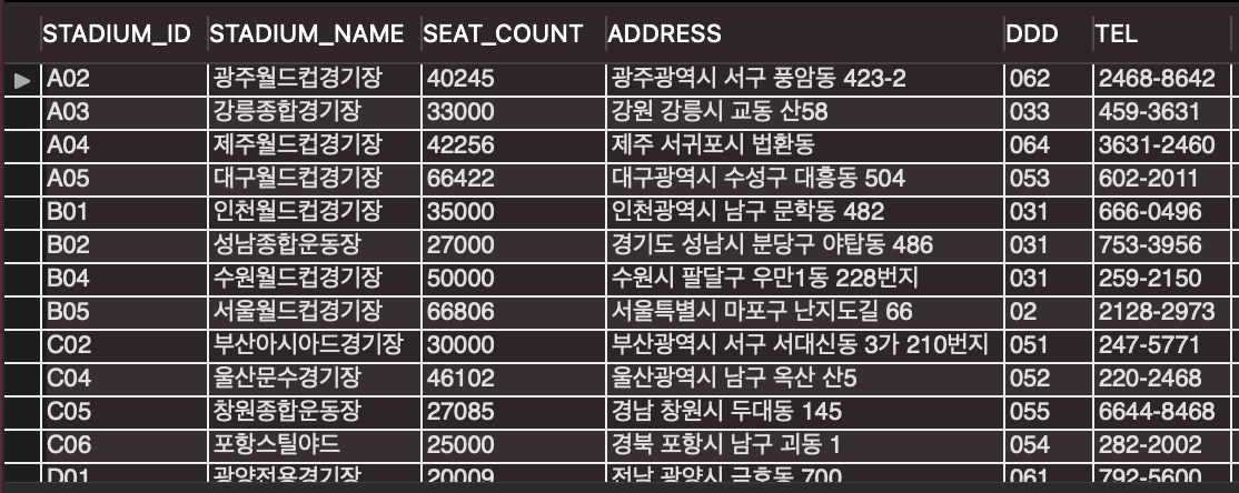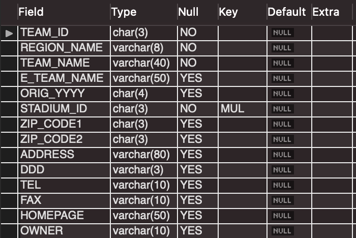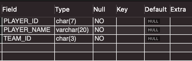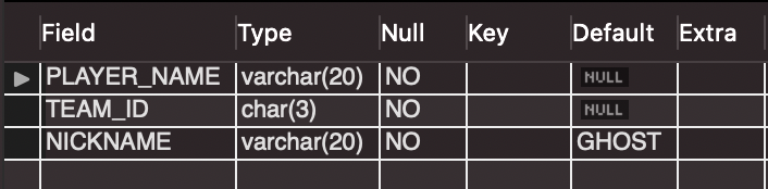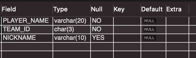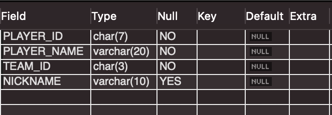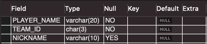 DESCRIBE PLAYER; --현재 테이블의 상태를 보여주는 명령어