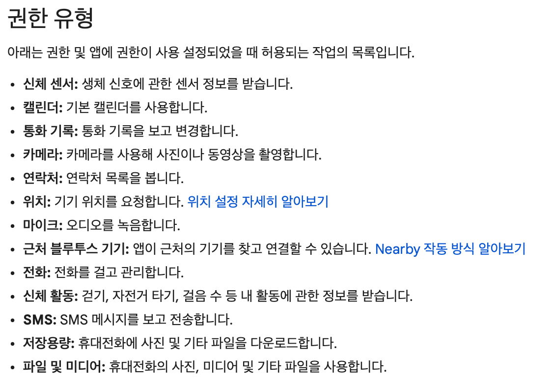 안드로이드에서는 앱이 아래와 같은 것들에 접근하여 파일이나 데이터를 이용하게 되려면 사용자가 그 권한을 확인을 해야만 접근이 가능하다.