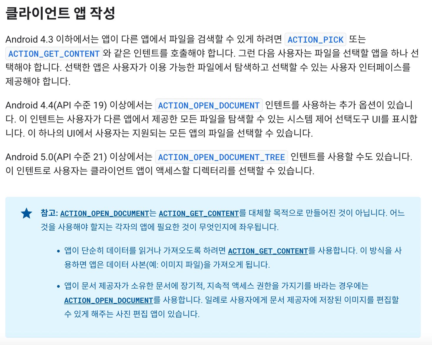서로 다른 앱 사에서 파일등을 전송할때는 Content Provider라는 것을 사용한다고 한다. 이번 예제에서는 SAF(Storage Access Framework)를 사용한 것인데, 이러한 것들을 간단한 코드로 할 수 있게 해준다.