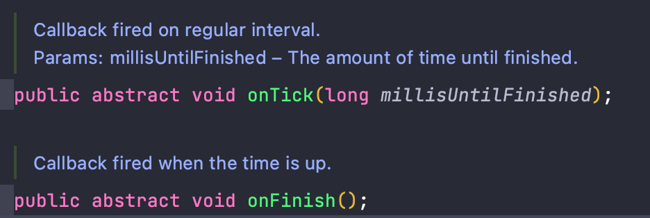 1초마다 카운트 다운이 되는 것을 구현해줘야 했다. 아마 쓰레드를 공부해보면서, Post.delayed를 통해서 구현했었던 기억이 있다. 그때는 1초마다 메시지를 전해줘 핸들러에서 처리하게 해줬었는데 CountDownTimer이라는 객체가 존재했다.