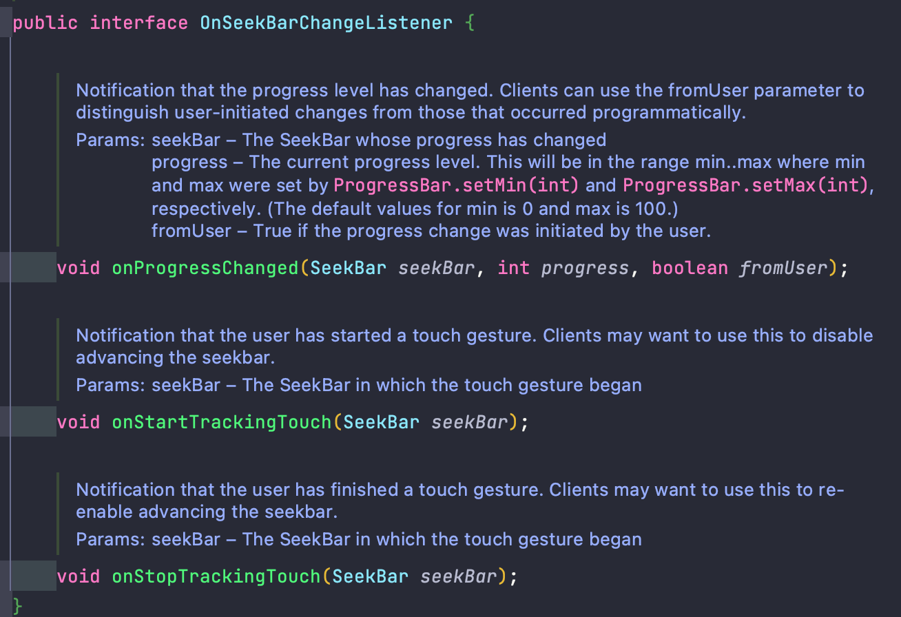 OnSeekBarChangeListener는 인터페이스로서 onProgressChanged, onStartTrackingTouch, onStopTrackingTouch를 구현줘야 한다. 각각 순서대로 Progress가 바뀔때, 슬라이더가 터치 되어 움직일때, 슬라이더의 움직임이 멈칠때의 기능을 구현해줘야한다.