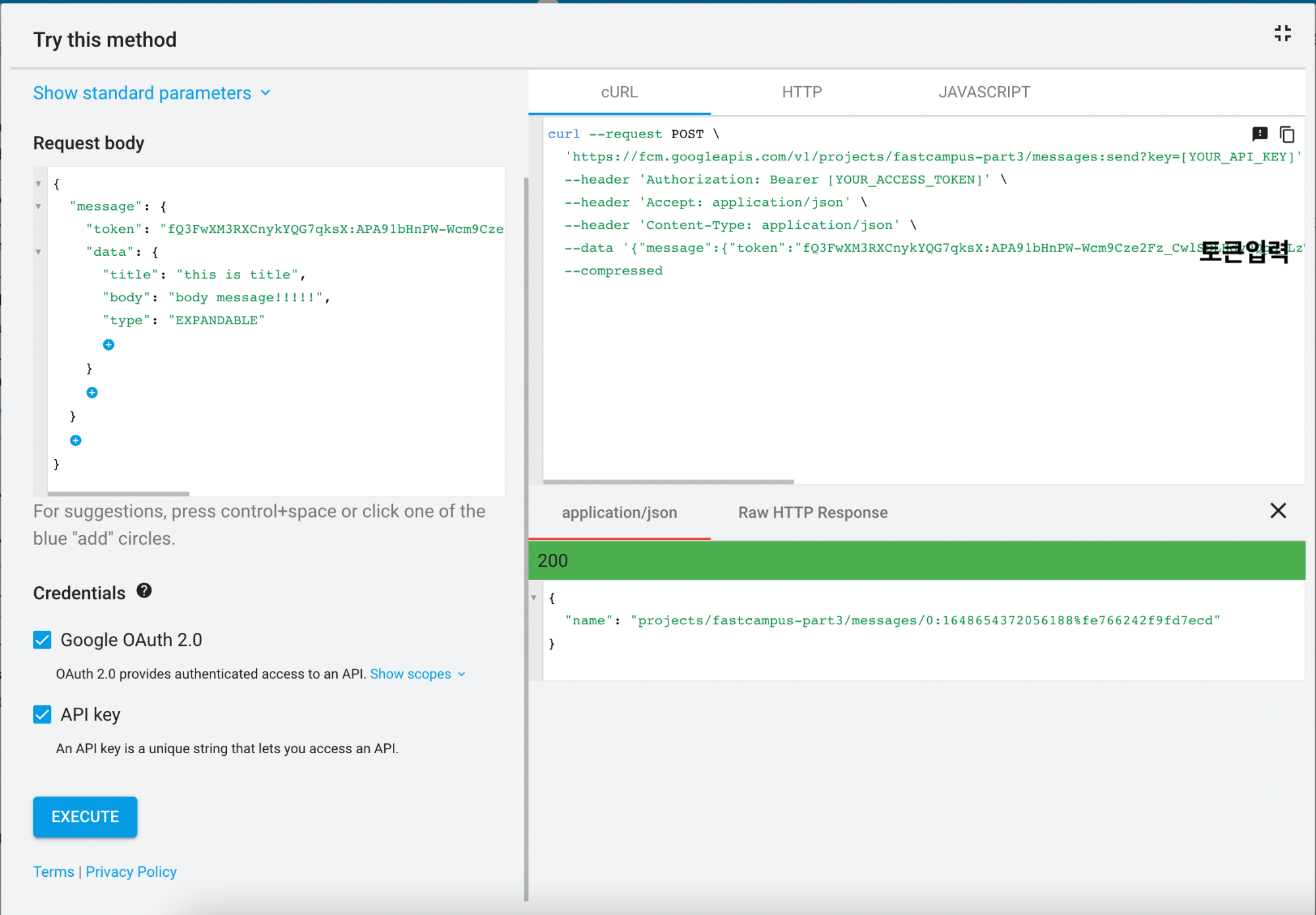 물론 위 코드는 공식문서에 친절히 기재 돼 있다. 여기서 받은 토큰을 복사하여, 추후에 cloud message에서 send기능을 이용할때 토큰을 이용 하면 된다.