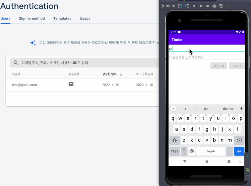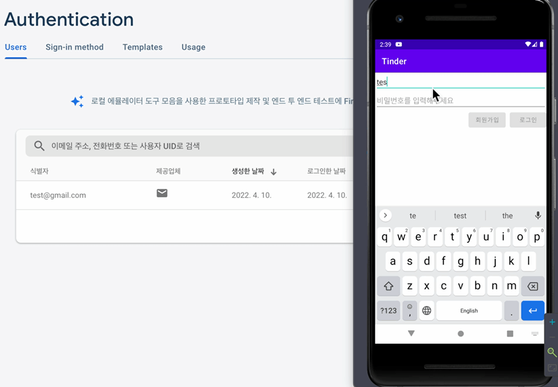 아마 안드로이드의 가장 기초면서 가장 많이쓰이는 기술이 아닐까 싶다. 파이어베이스 Authentication을 이용하여 email로그인 회원가입 기능을 구현하는 것인데, 다른 소셜 로그인도 지원을 하기 때문에 로그인 단계를 편리하게 사용할 수 있다.