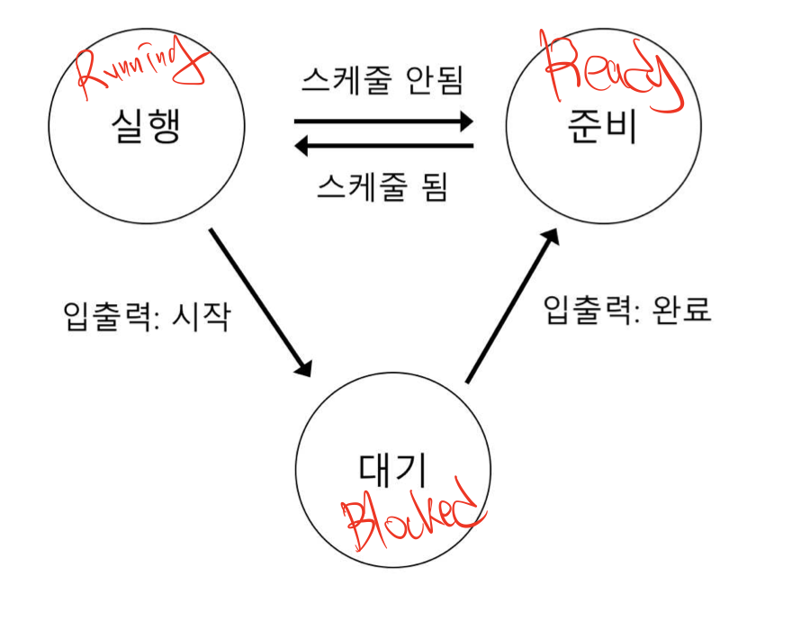 프로세스는 실행,준비,대기 3가지 상태로 정의 된다. 해당 개념은 I/O와 같은 interupt가 발생 시 동작을 알아내기 위해 중요하다. 작년에 시스템 소프트웨어교과를 수강하면서 꽤 애를 먹은 기억이 있다.