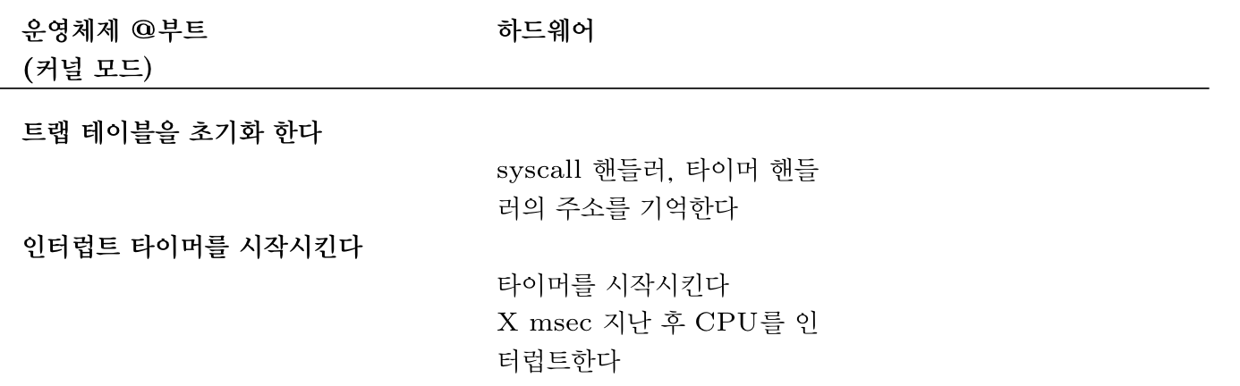 제한적 직접 실행(Limited Direct Execution)에서 하드웨어 I/O나 시스템콜을 위해서 운영체제의 trap table을 하드웨어에게 알려준거와 똑같이 운영체제는 이러한 준비를 한다. 어디를 실행할지 미리 알려준다.
