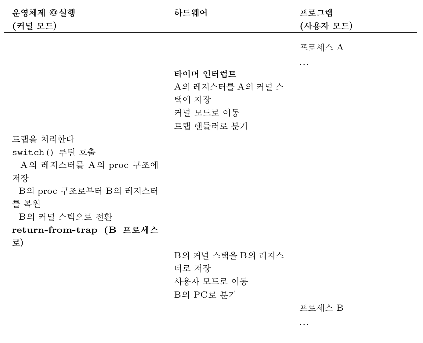 또한 프로세스가 중간에 중지 됐다가 다른프로세서가 실행되고 다시 돌아오는 과정은 프로세서가 보기에는 연속된 동작이여야 한다. 타이머 인터럽트가 발생했을 때에도 레지스터와 플래그들을 프로세스별로 저장시킨 후, return-from-trap할때 복원시킨다.