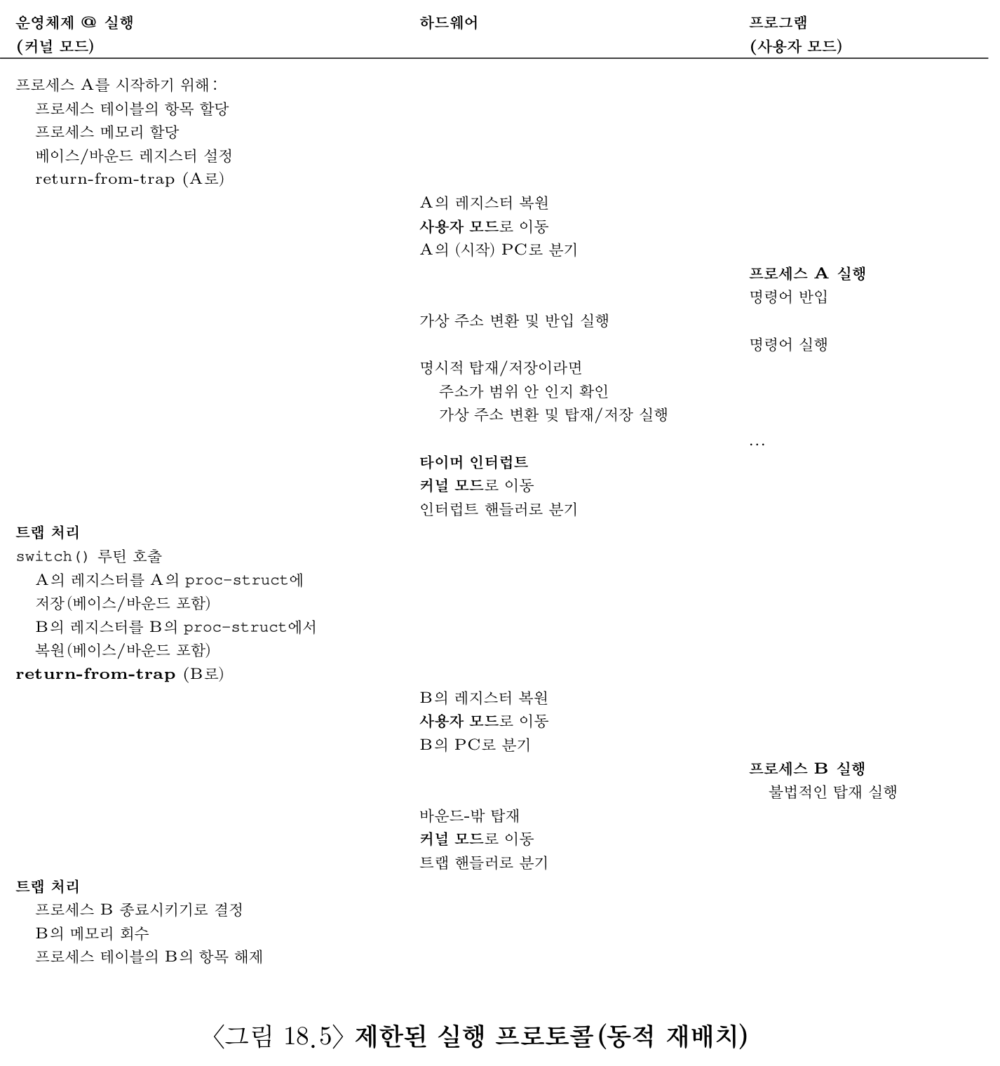 운영체제는 프로세스사이의 문맥교환이 생길때 프로세스마다의 베이스-바운드쌍을 저장하고 복원해야한다. 이 것들은 프로세스 제어 블럭(process control block, PCB)라 불리는 곳에서 관리한다. 시스템소프트웨어를 수강할때 상당히 많이 사용했던 기억이 있다. 문맥 교환말고도 프로세스가 처음 실행 될때 또한 알맞은 베이스-바운드 값으로 설정해야 한다.