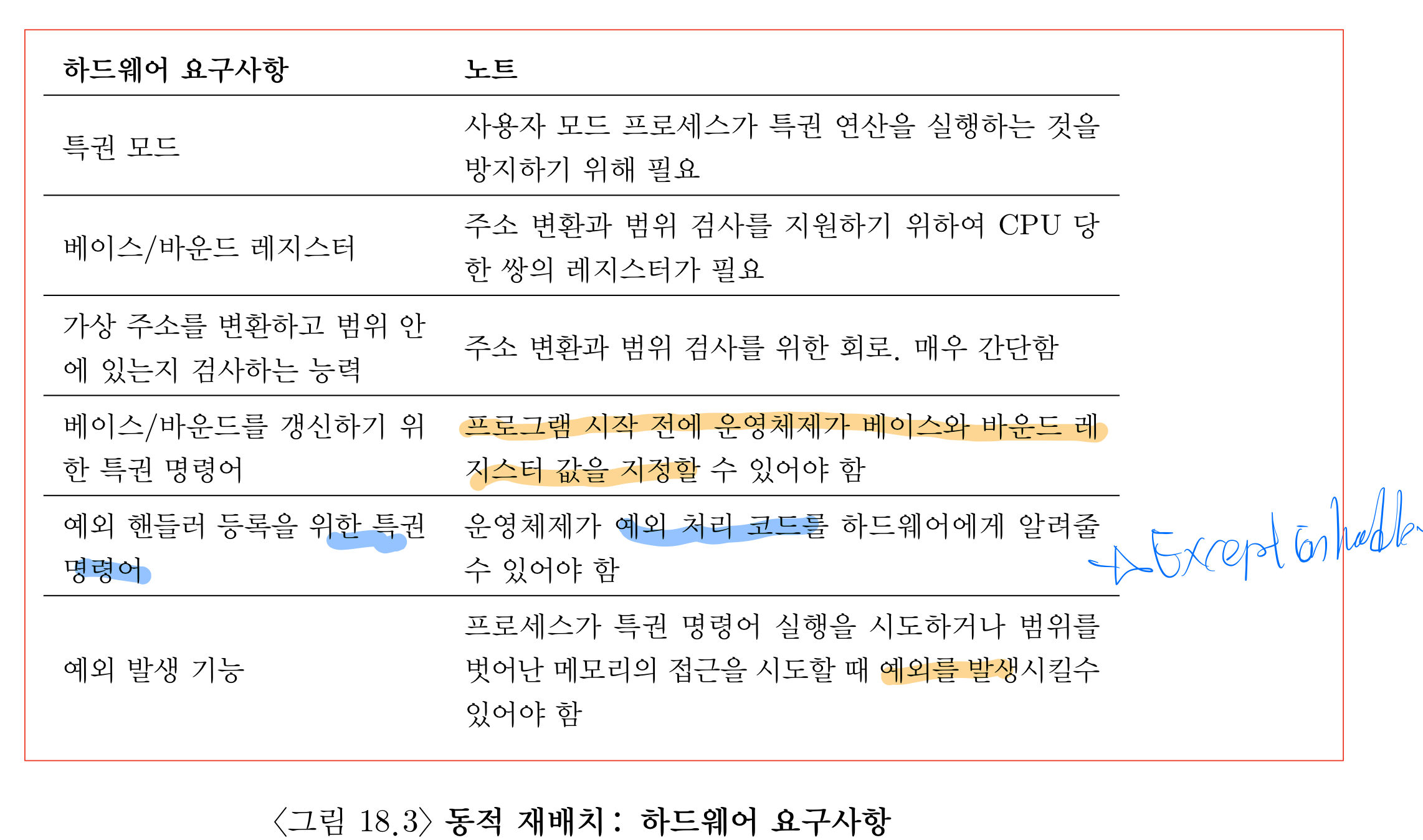 하드웨어는 베이스-바운드 레지스터 값을 변경하는 명령어를 제공해야한다. 프로세스가 전환되면 베이스와 바운드의 값이 달라지게 되는데 MMU에 있는 레지스터에게 이 것을 알여야 하기 때문인다. 당연히 커널모드에서만 변경이 가능해야 한다.