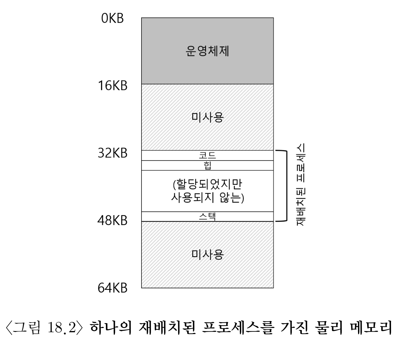 실제 물리메모리에서의 배치는 아래와 같다. 프로세스를 실제 메모리의 다른 공간에 재배치(relocation)했다. 그렇다면 어떻게 32KB의 물리주소에서 시작되는 걸, 프로세스가 0KB라고 착각하게 할까? 또 데이터를 불러오려면 해당 주소공간에 접근해야하는데 그러한 과정을 어떻게 처리해주는 것일까라는 의문이 남는다.