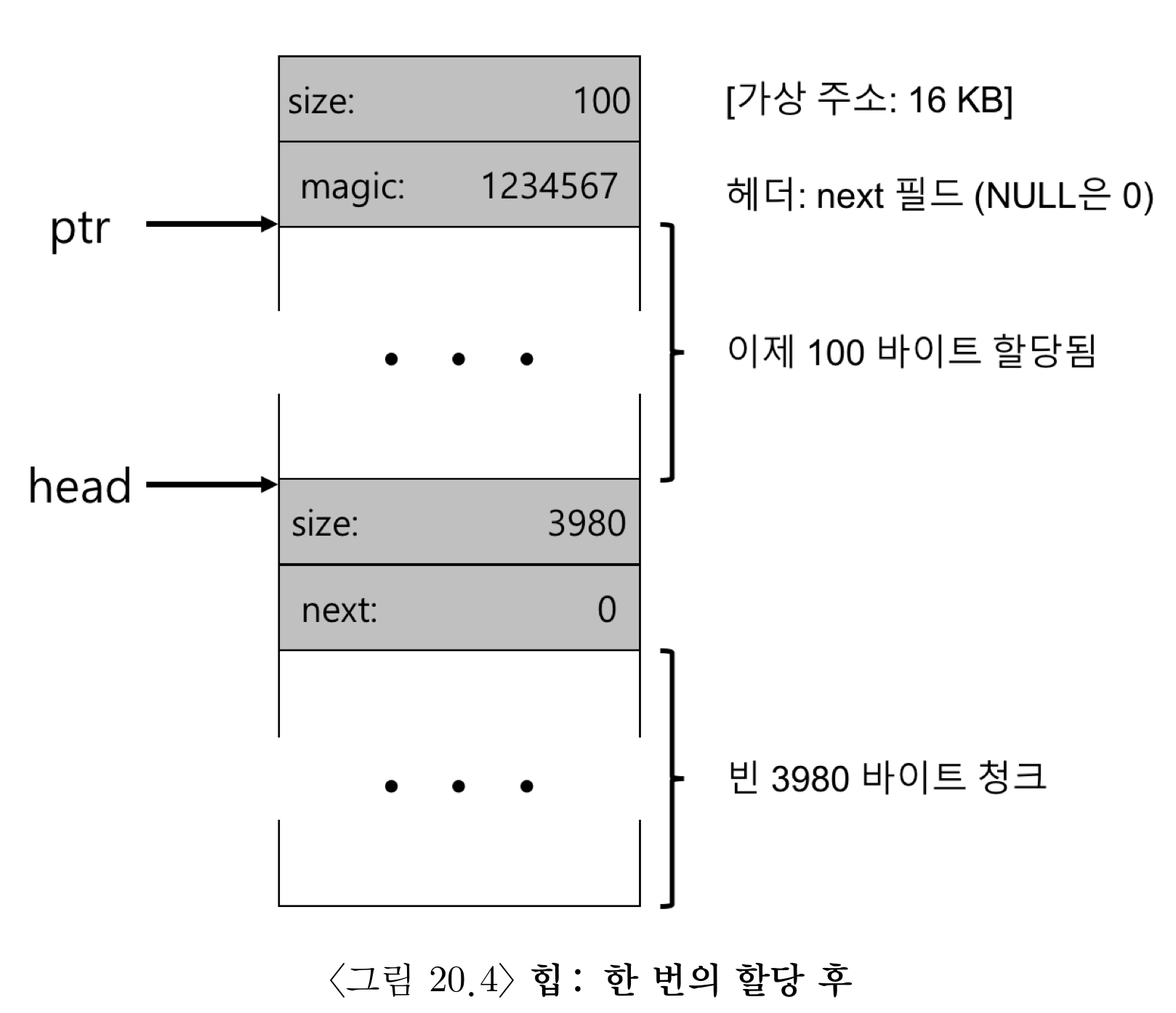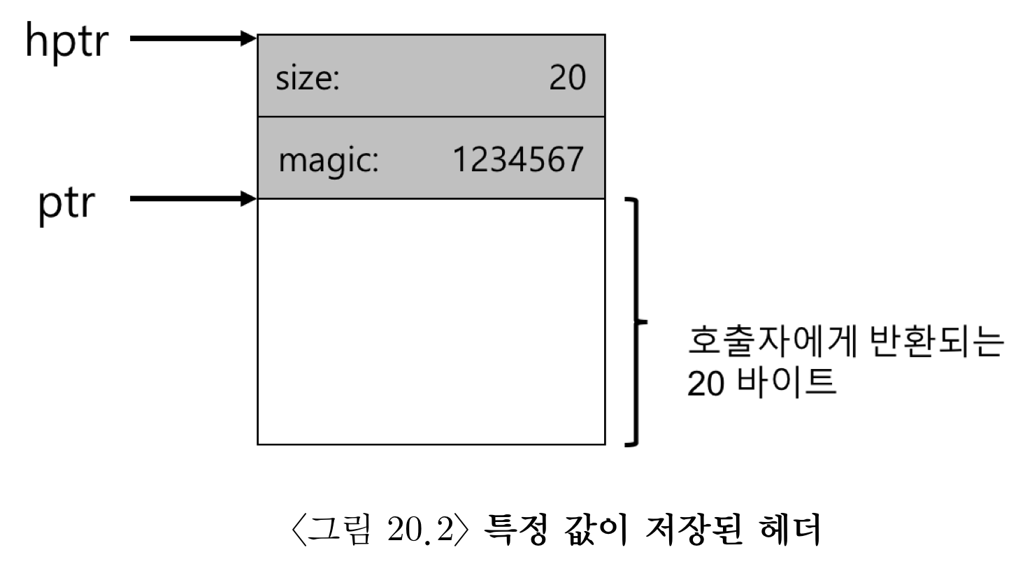 헤더는 최우선적으로 할당된 메모리의 크기를 알아야한다. 그리고 부가적으로 무결성 검사를 위한 magic넘버나, 추가적인 포인터 등을 가지고 있을 수 있다. 내가 20의 메모리를 할당받았다 하더라도 헤더가 있기때문에 헤더의 크기만큼이 포함된 영역이 배정된다.