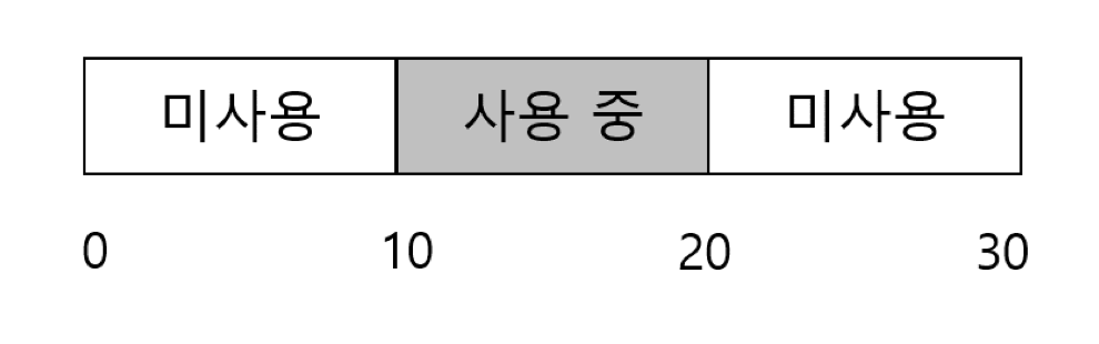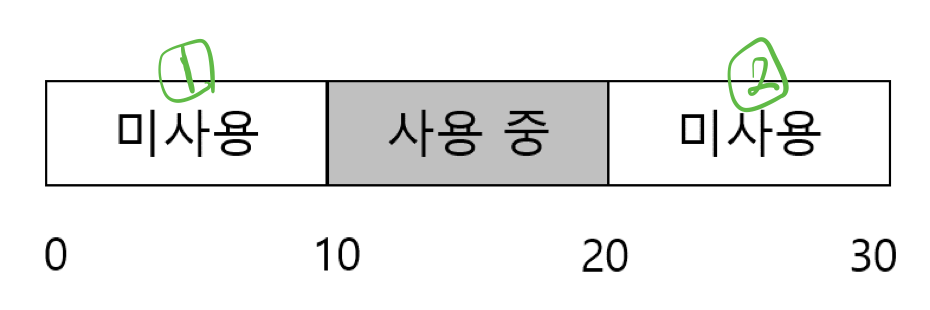 30바이트의 힙이 아래와 같다. 두개의 미사용공간의 존재하고 가운데 사용중인 공간이 존재한다.