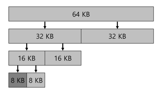 위 그림처럼 최초의 공간이 있다면, 메모리 요청이 발생하면, 요청을 충족시키기에 충분한 공간을 발견할때까지 빈공간을 계속 절반으로 나누어 간다. 아래는 7KB의 상황을 요청할 때이다. 2의 거듭제곱만큼 크기의 블록을 할당할수 있기때문에 내부 단편화 문제가 발생해 빈공간이 생길 수 있다.
